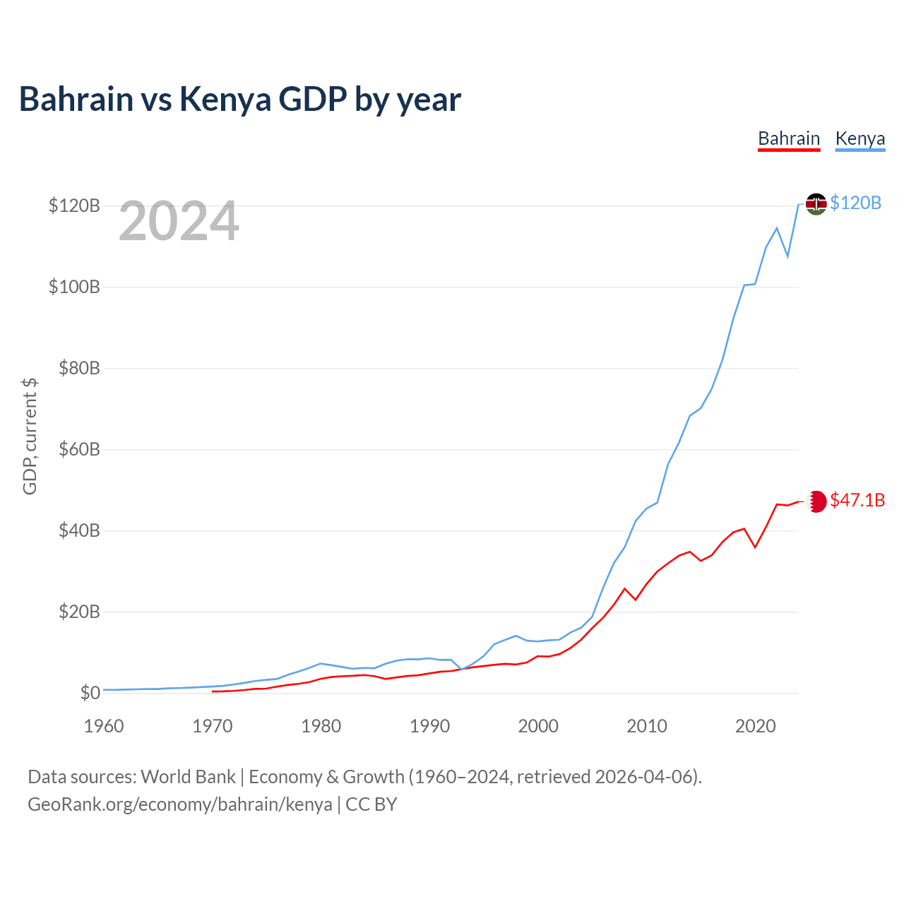 Bahrain has a GDP of $47.1B compared to $120B for Kenya, ranking 96/197 and 64/197 by economy size, respectively.