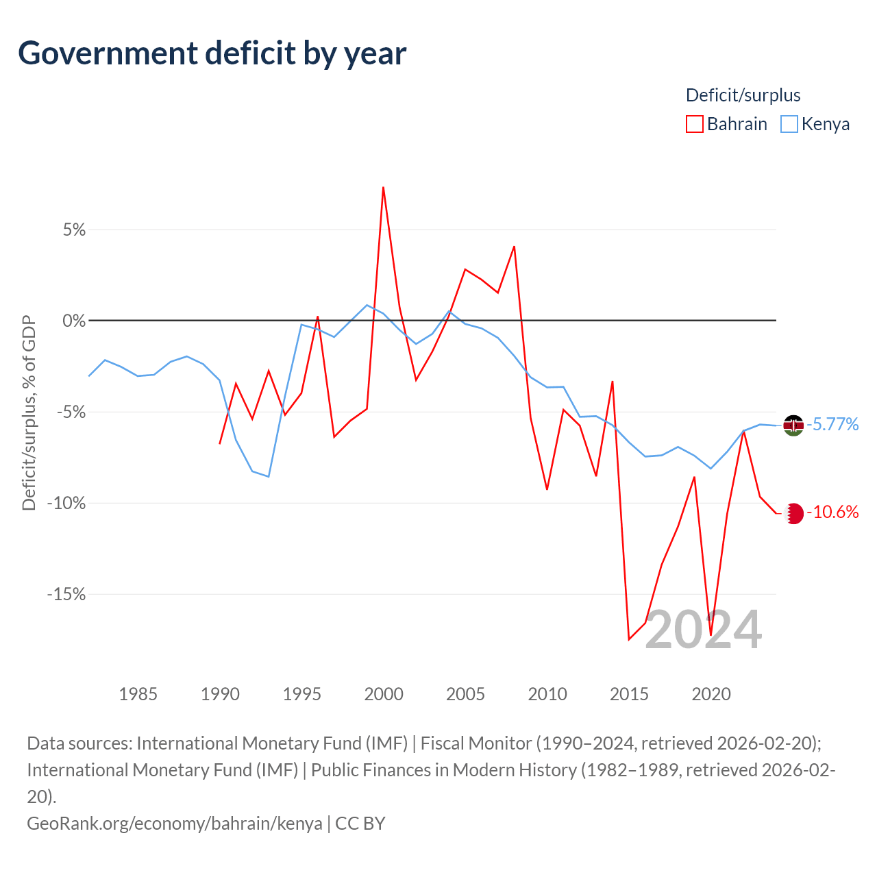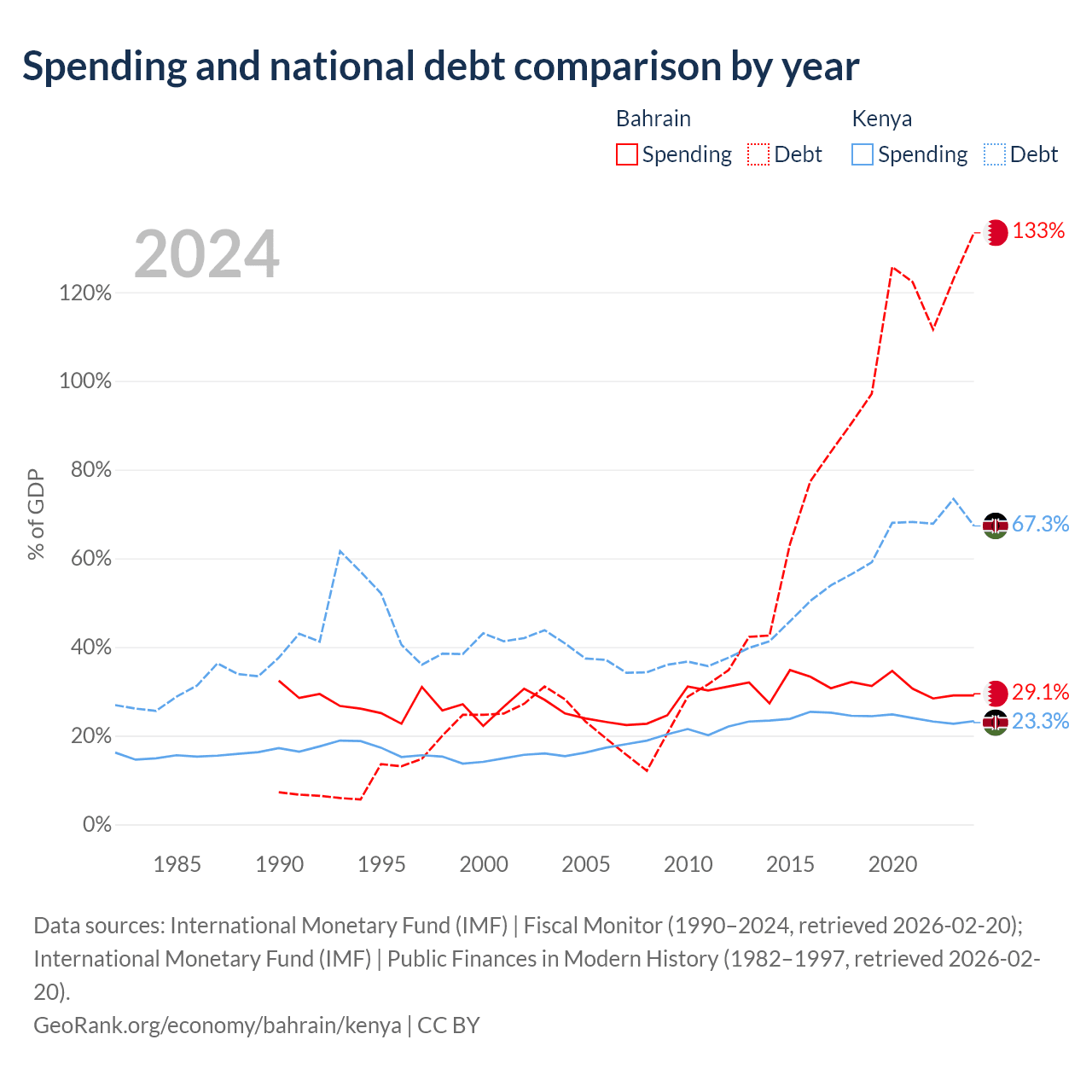 Bahrain has $62.8B in government debt (133.4% of GDP), compared to $81B (67.3% of GDP) in Kenya.