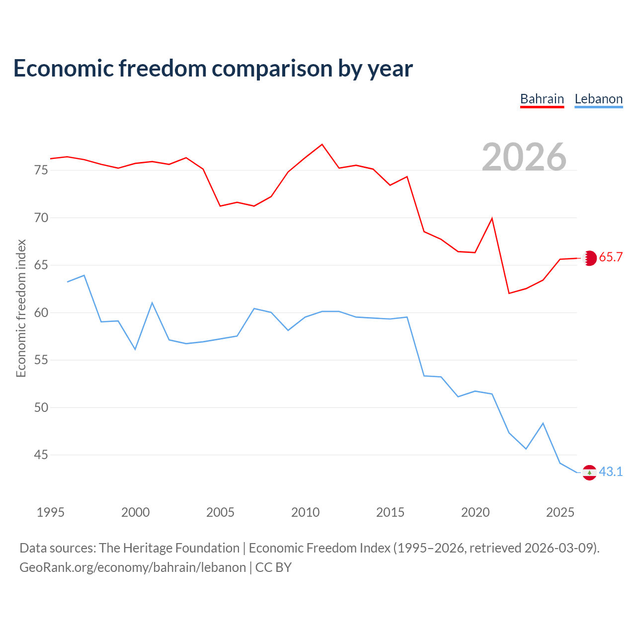 The Economic Freedom Index for Bahrain is 65.7, ranking 63/197, compared to 43.1 for Lebanon, ranking 183/197. The chart above displays a comparison of annual changes in economic freedom indexes.