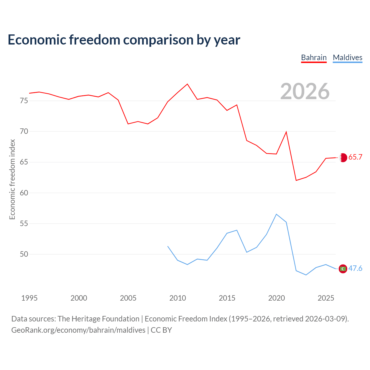 The Economic Freedom Index for Bahrain is 65.7, ranking 63/197, compared to 47.6 for Maldives, ranking 174/197. The chart above displays a comparison of annual changes in economic freedom indexes.