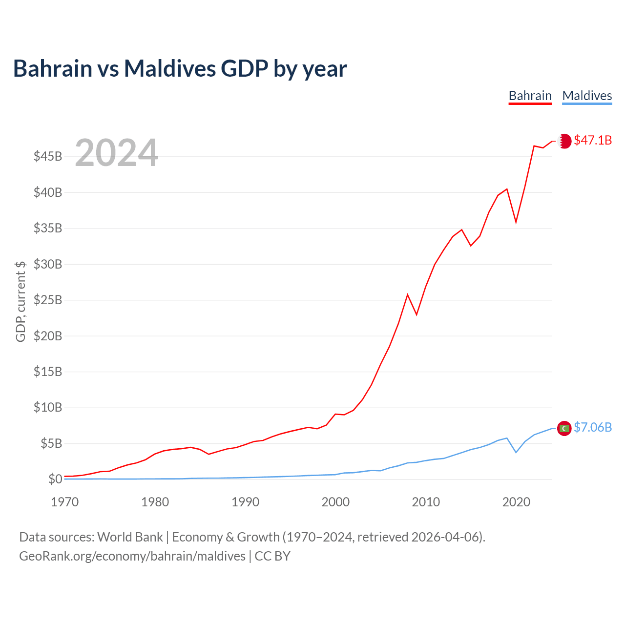 Bahrain has a GDP of $47.1B compared to $7.06B for Maldives, ranking 96/197 and 159/197 by economy size, respectively.