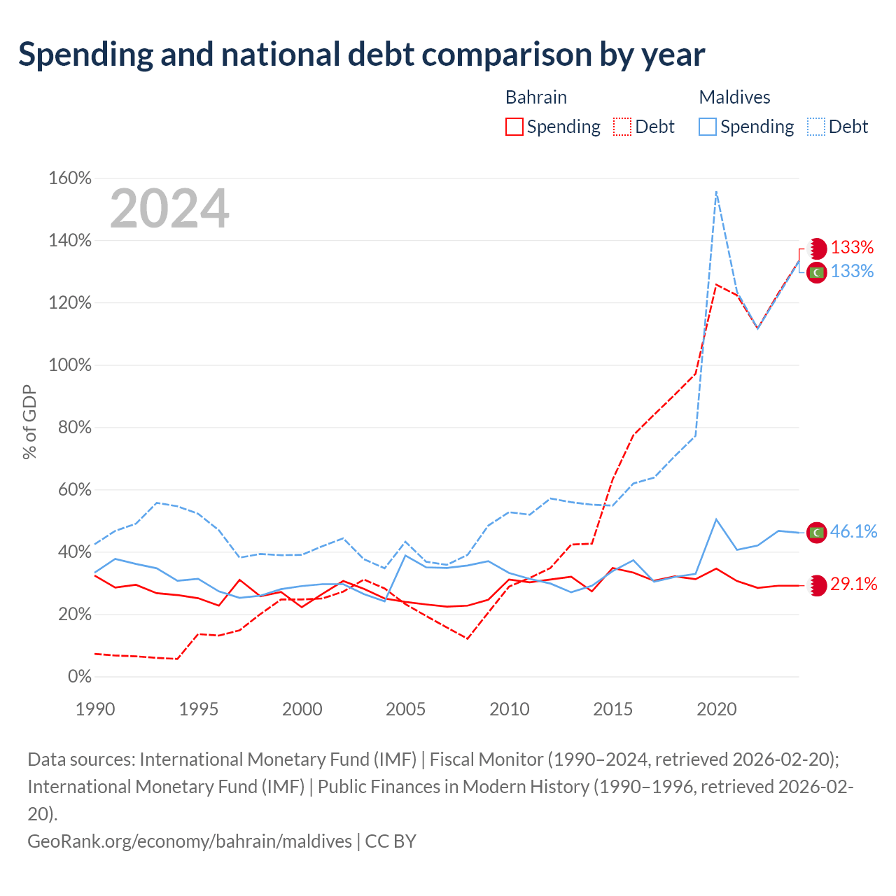Bahrain has $62.8B in government debt (133.4% of GDP), compared to $9.41B (133.3% of GDP) in Maldives.