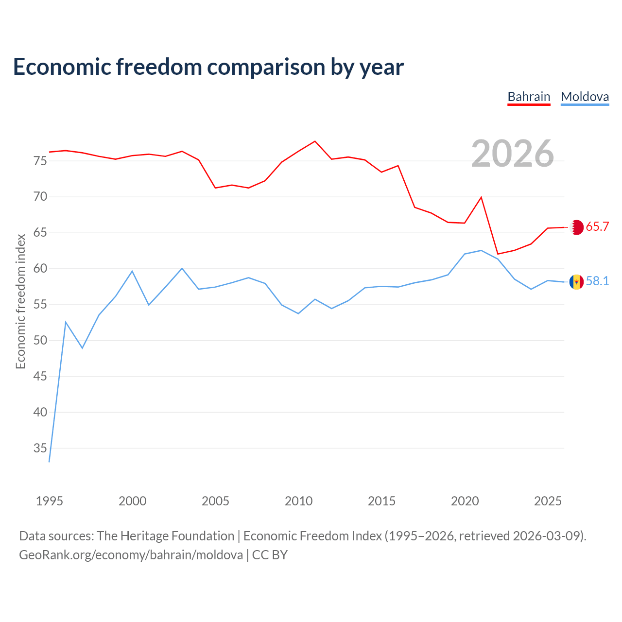 The Economic Freedom Index for Bahrain is 65.7, ranking 63/197, compared to 58.1 for Moldova, ranking 112/197. The chart above displays a comparison of annual changes in economic freedom indexes.