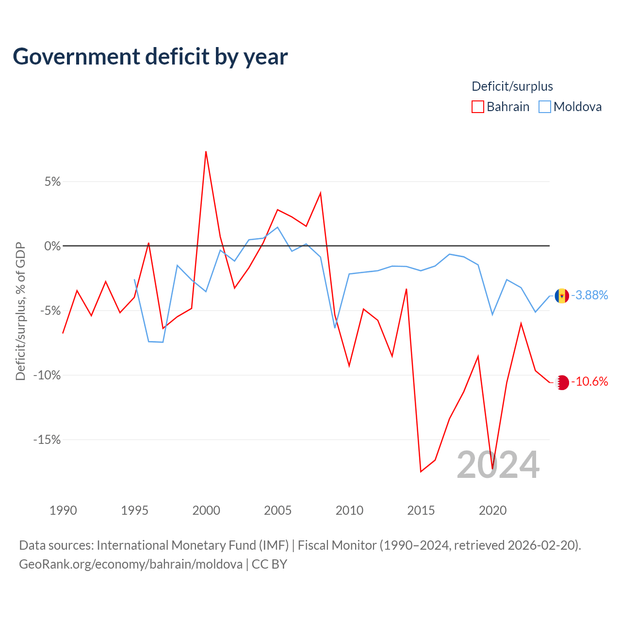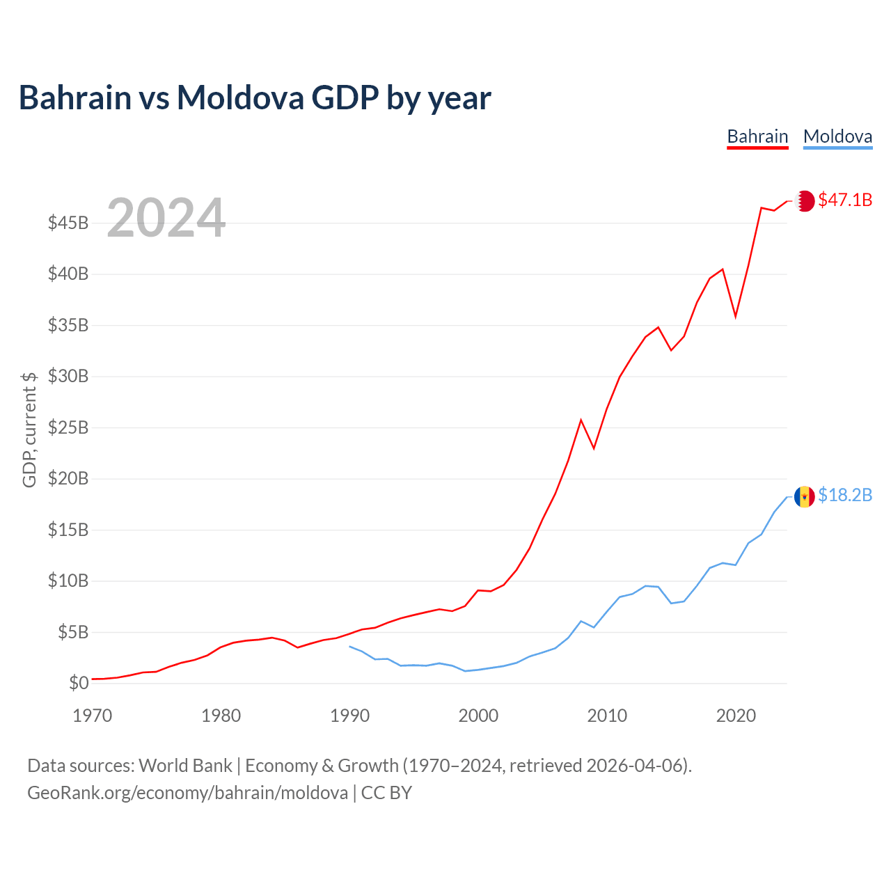 Bahrain has a GDP of $47.1B compared to $18.2B for Moldova, ranking 96/197 and 134/197 by economy size, respectively.
