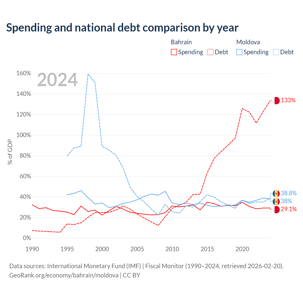 Bahrain has $62.8B in government debt (133.4% of GDP), compared to $7.06B (38.8% of GDP) in Moldova.
