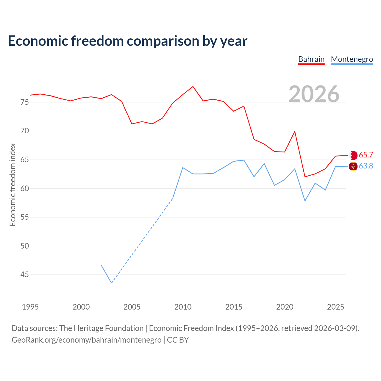 The Economic Freedom Index for Bahrain is 65.7, ranking 63/197, compared to 63.8 for Montenegro, ranking 78/197. The chart above displays a comparison of annual changes in economic freedom indexes.