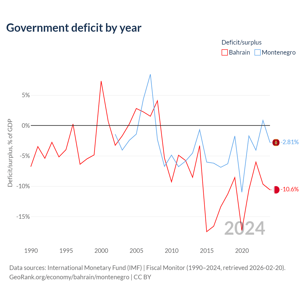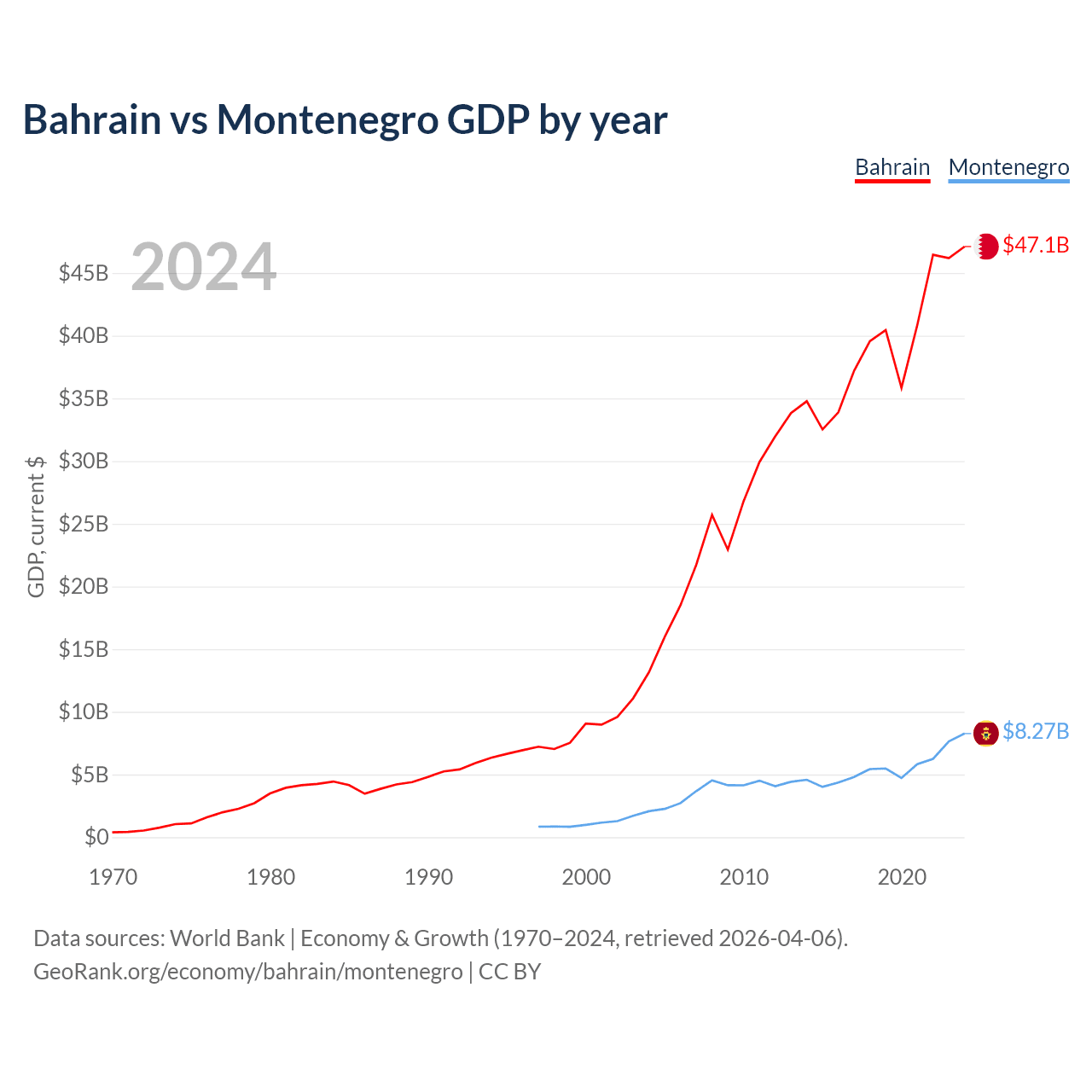 Bahrain has a GDP of $47.1B compared to $8.27B for Montenegro, ranking 96/197 and 155/197 by economy size, respectively.