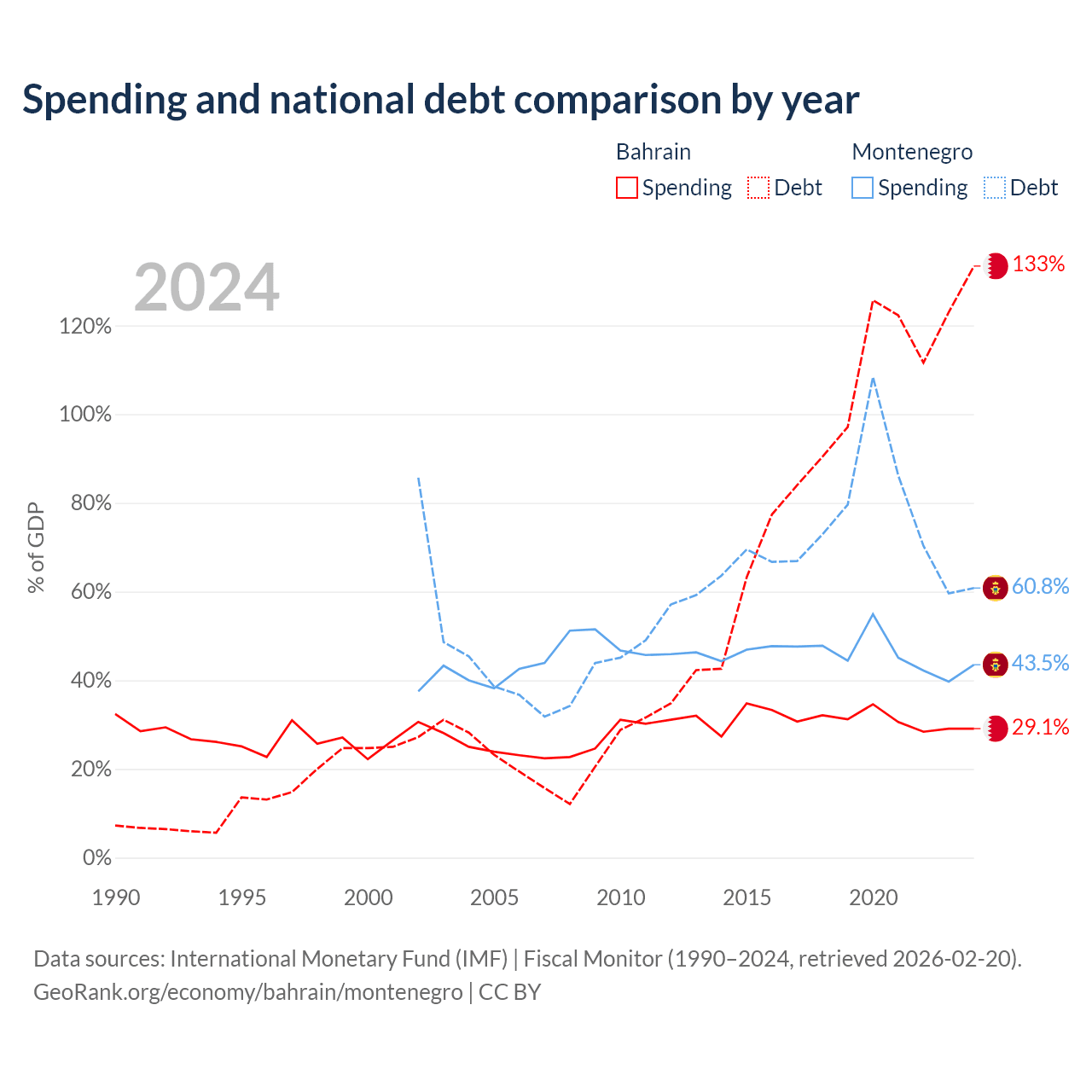 Bahrain has $62.8B in government debt (133.4% of GDP), compared to $5.02B (60.8% of GDP) in Montenegro.