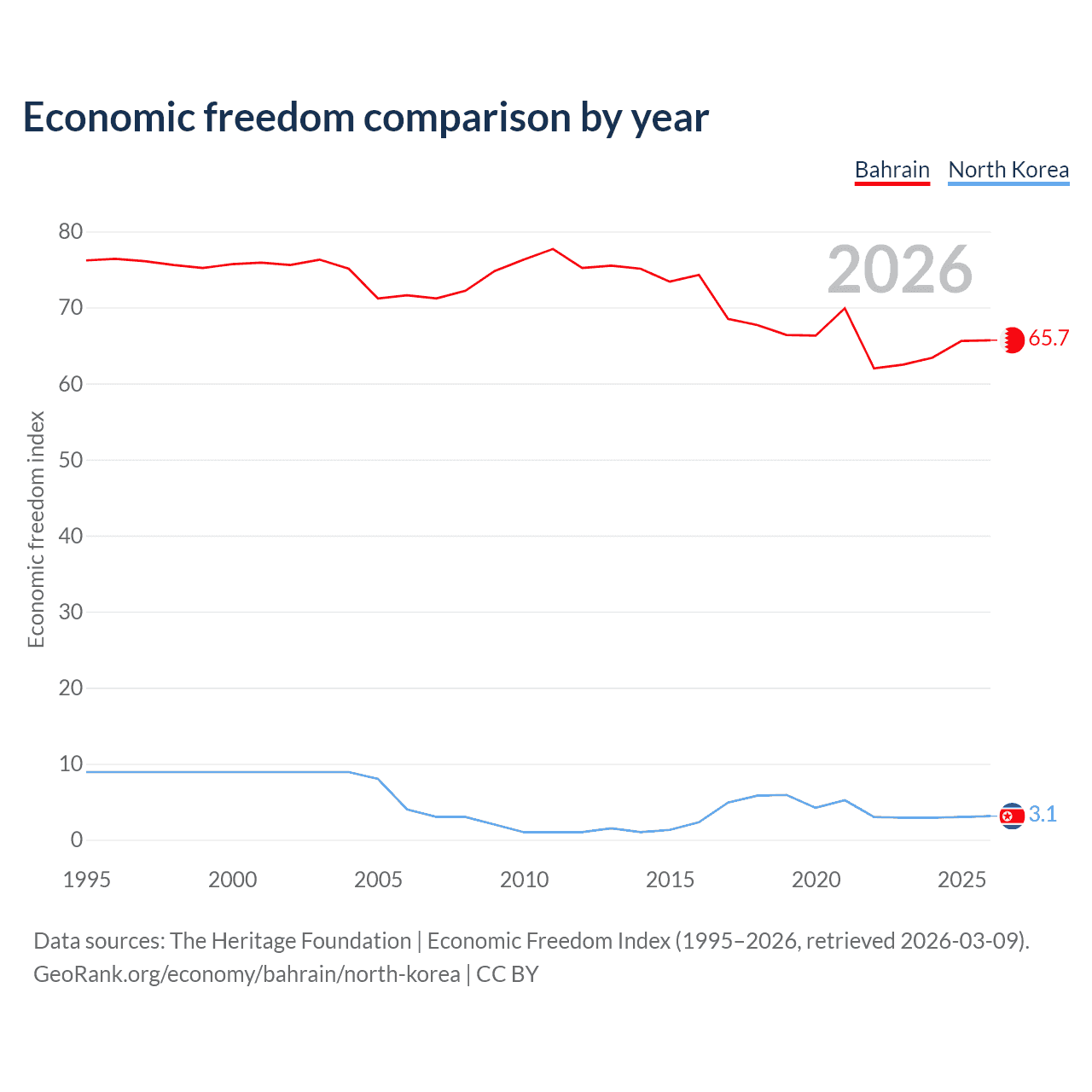 The Economic Freedom Index for Bahrain is 65.7, ranking 63/197, compared to 3.1 for North Korea, ranking 197/197. The chart above displays a comparison of annual changes in economic freedom indexes.