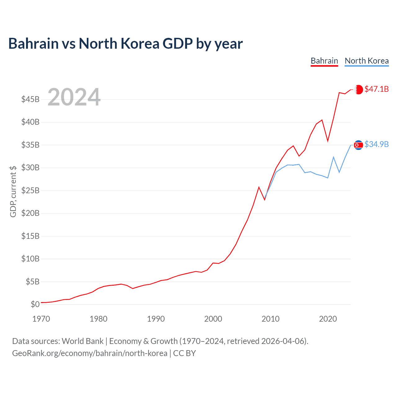 Bahrain has a GDP of $47.1B compared to $34.9B for North Korea, ranking 96/197 and 106/197 by economy size, respectively.