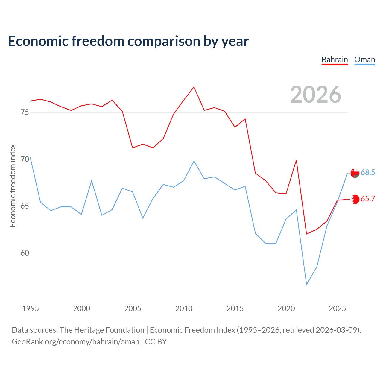 Data sources: The Heritage Foundation | Economic Freedom Index (1995–2026, retrieved 2026-03-09).