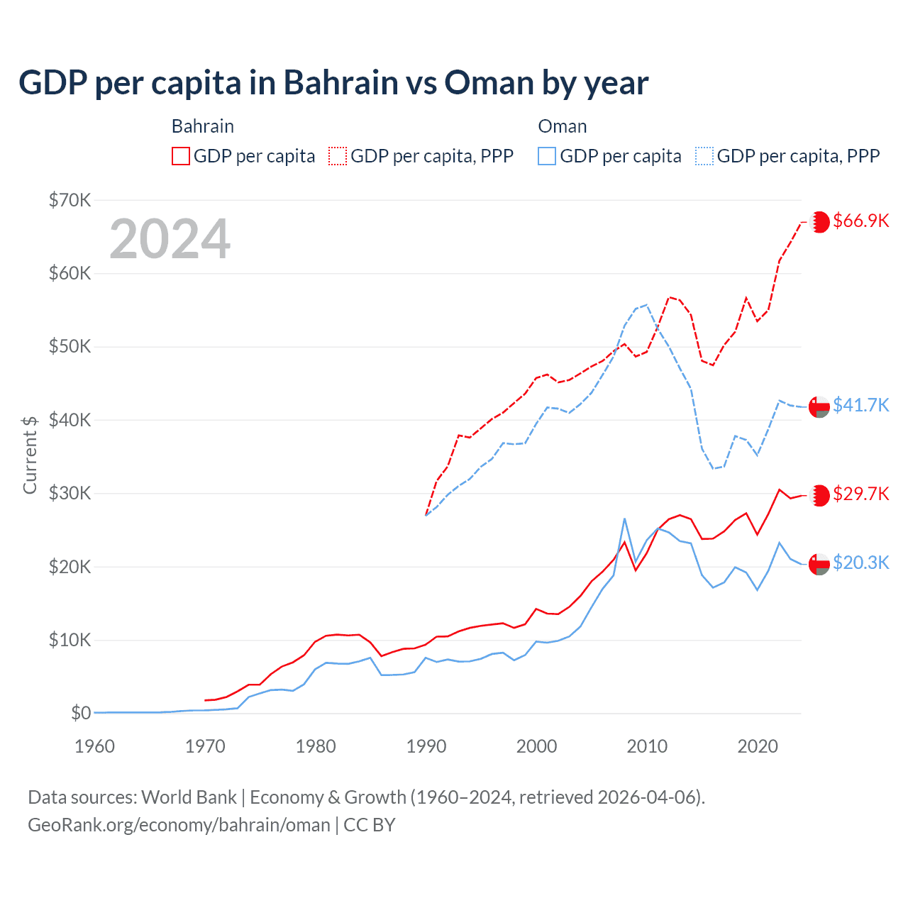 GDP per capita in Bahrain vs Oman by year