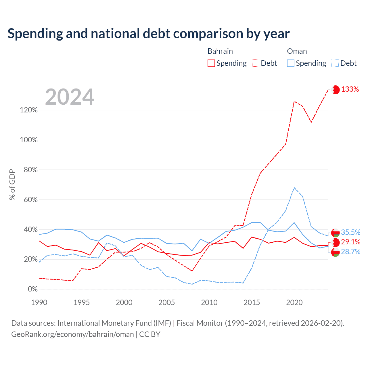 Bahrain has $62.8B in government debt (133.4% of GDP), compared to $38B (35.5% of GDP) in Oman.