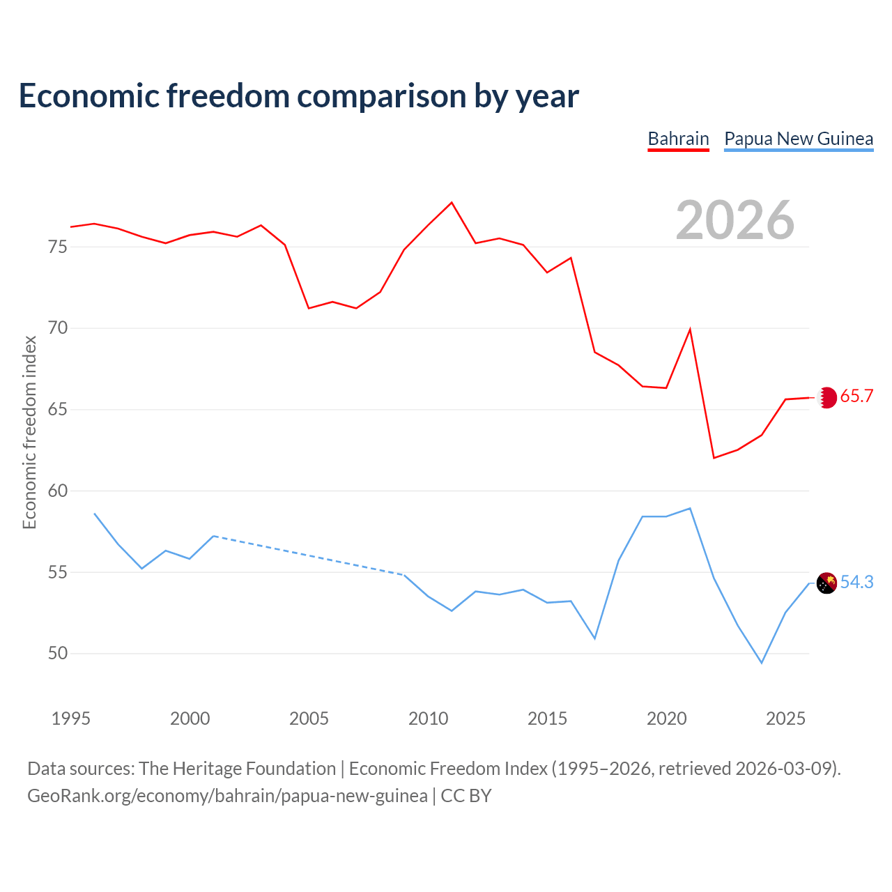 The Economic Freedom Index for Bahrain is 65.7, ranking 63/197, compared to 54.3 for Papua New Guinea, ranking 134/197. The chart above displays a comparison of annual changes in economic freedom indexes.