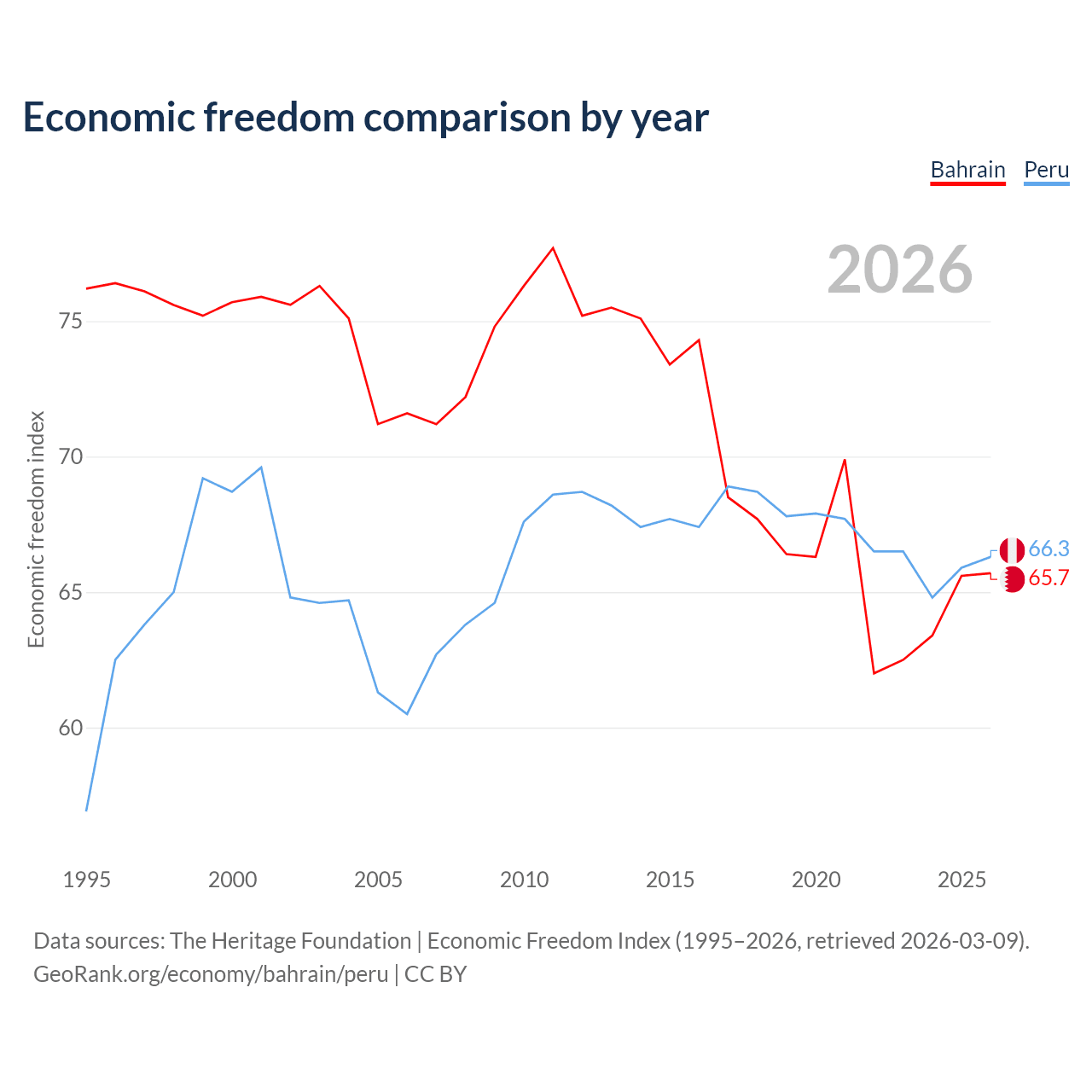The Economic Freedom Index for Bahrain is 65.7, ranking 63/197, compared to 66.3 for Peru, ranking 62/197. The chart above displays a comparison of annual changes in economic freedom indexes.