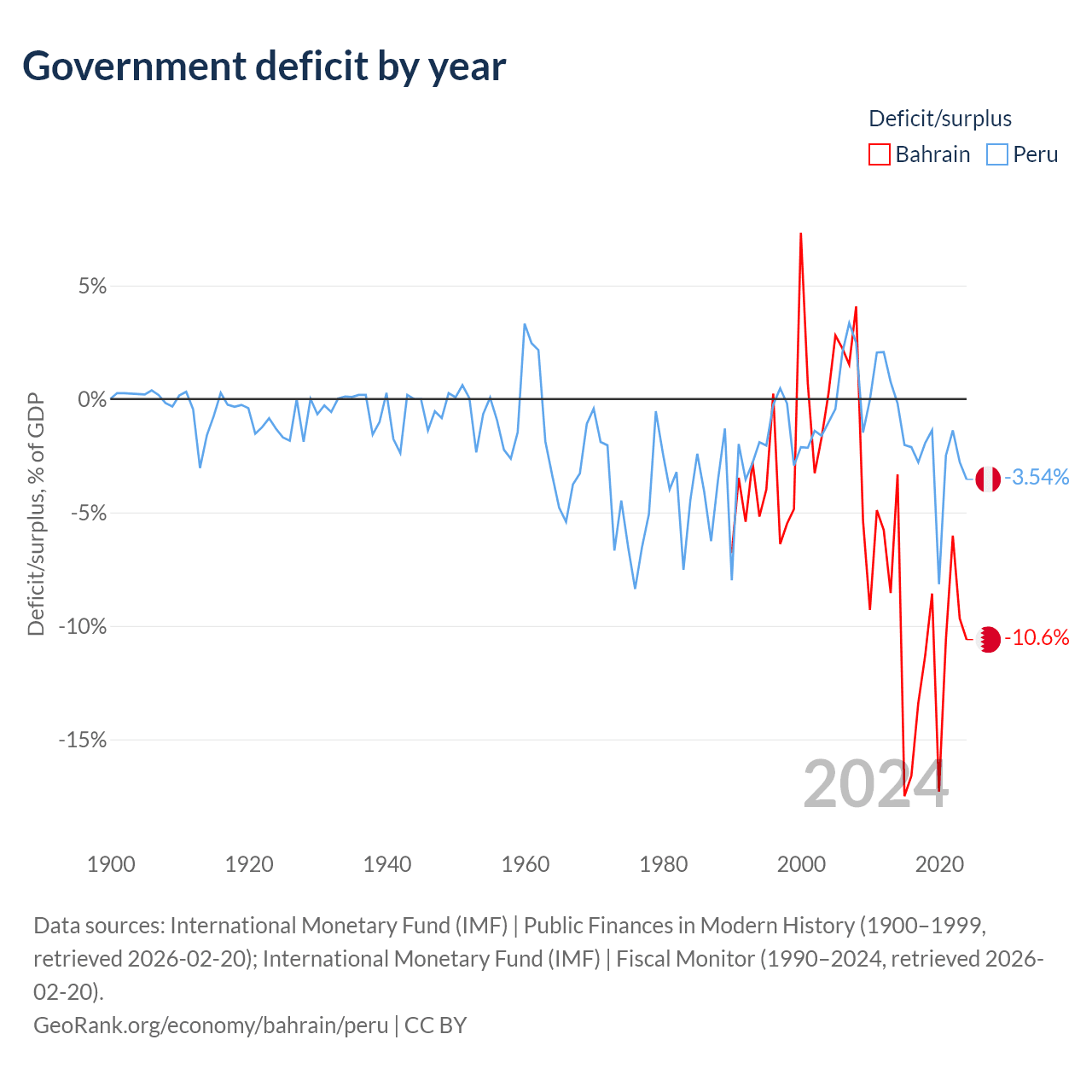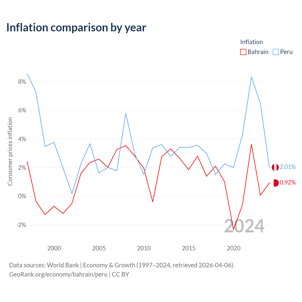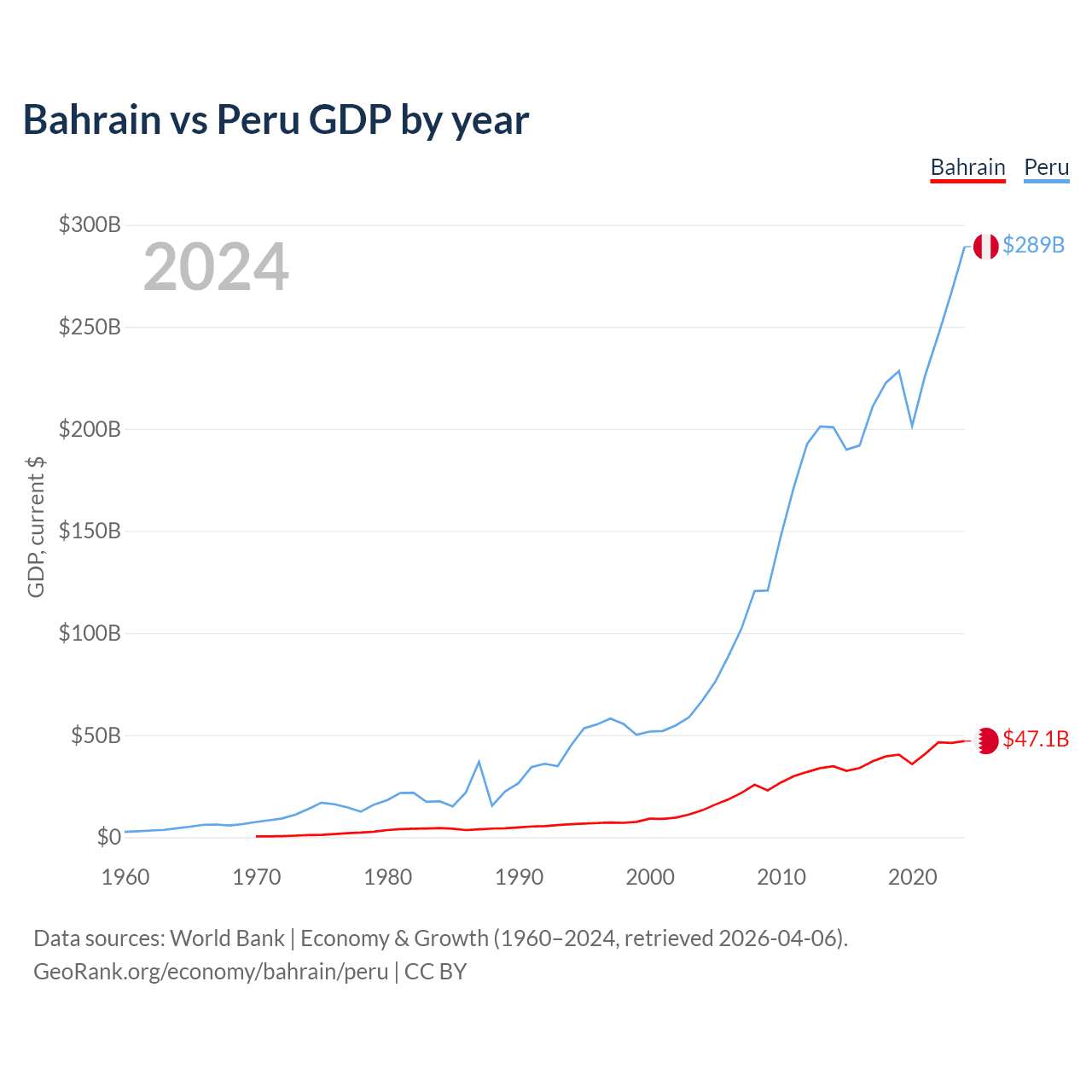 Bahrain has a GDP of $47.1B compared to $289B for Peru, ranking 96/197 and 49/197 by economy size, respectively.