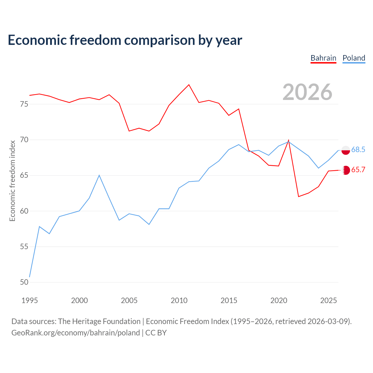 The Economic Freedom Index for Bahrain is 65.7, ranking 63/197, compared to 68.5 for Poland, ranking 46/197. The chart above displays a comparison of annual changes in economic freedom indexes.