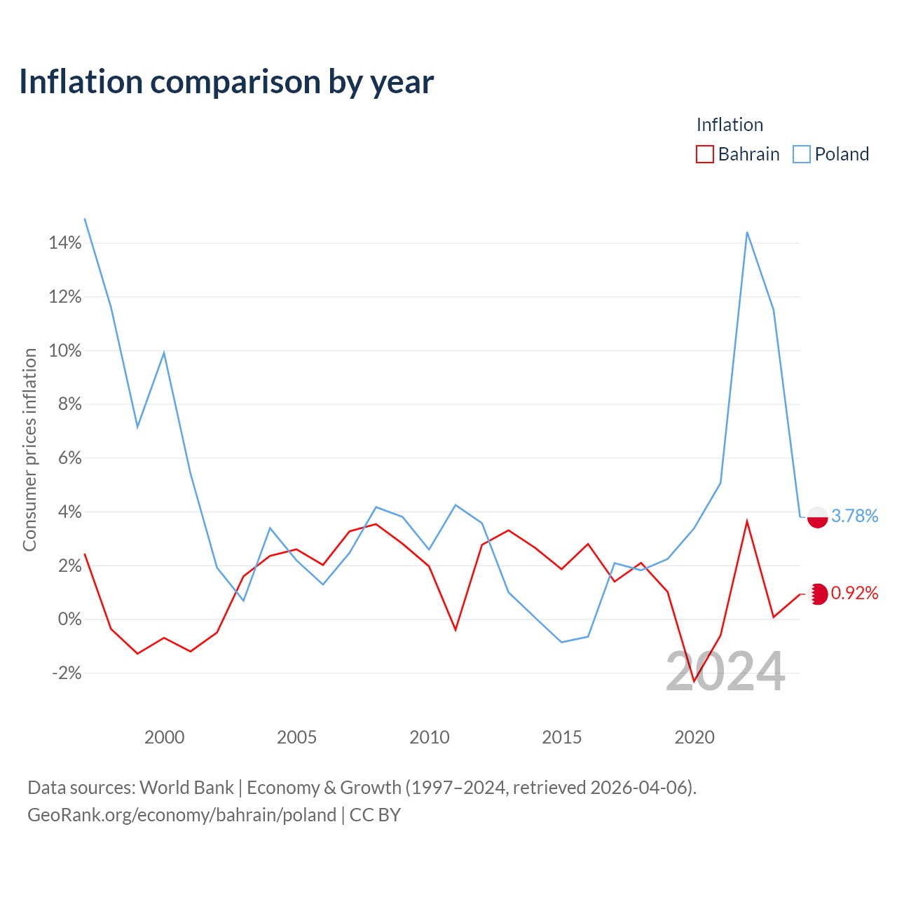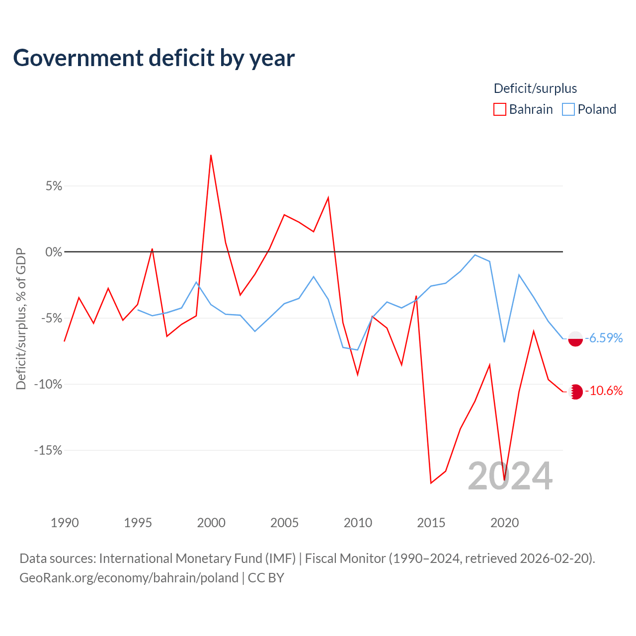 Bahrain has a GDP of $47.1B compared to $918B for Poland, ranking 96/197 and 21/197 by economy size, respectively.