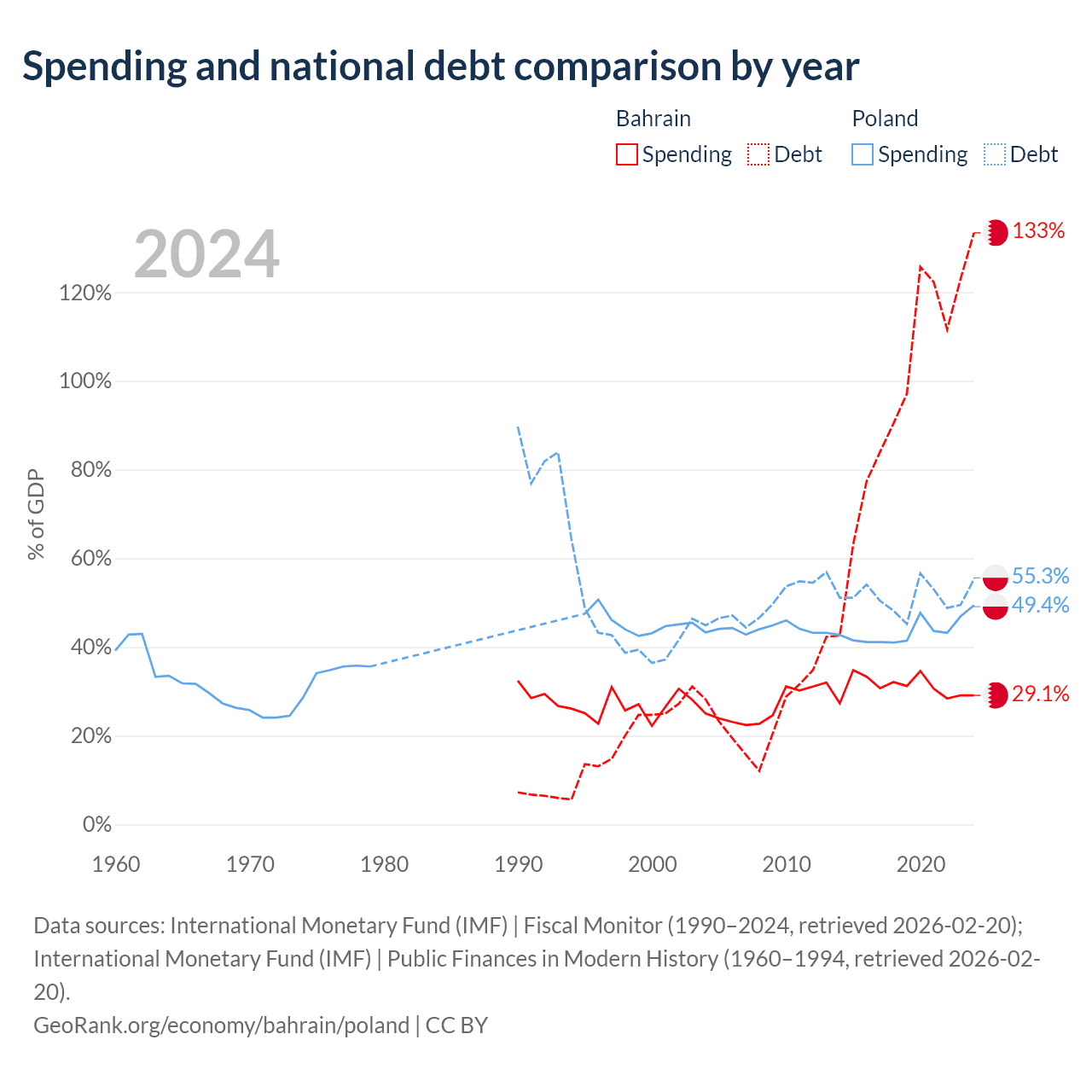 Bahrain has $62.8B in government debt (133.4% of GDP), compared to $507B (55.3% of GDP) in Poland.