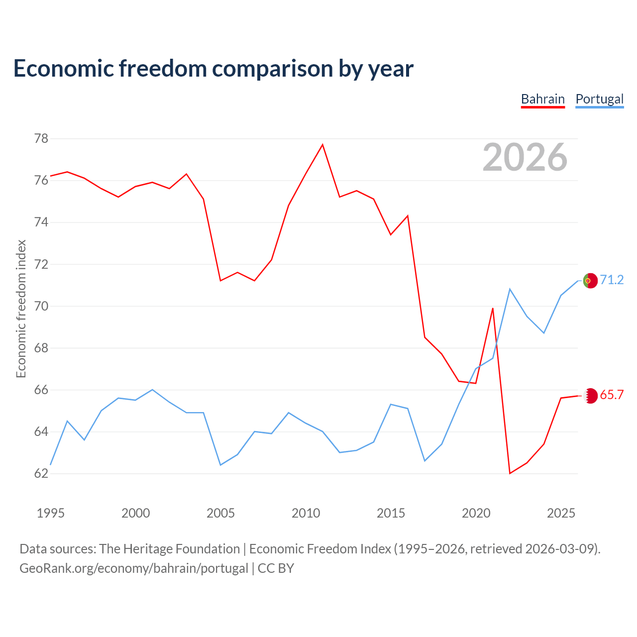 The Economic Freedom Index for Bahrain is 65.7, ranking 63/197, compared to 71.2 for Portugal, ranking 33/197. The chart above displays a comparison of annual changes in economic freedom indexes.