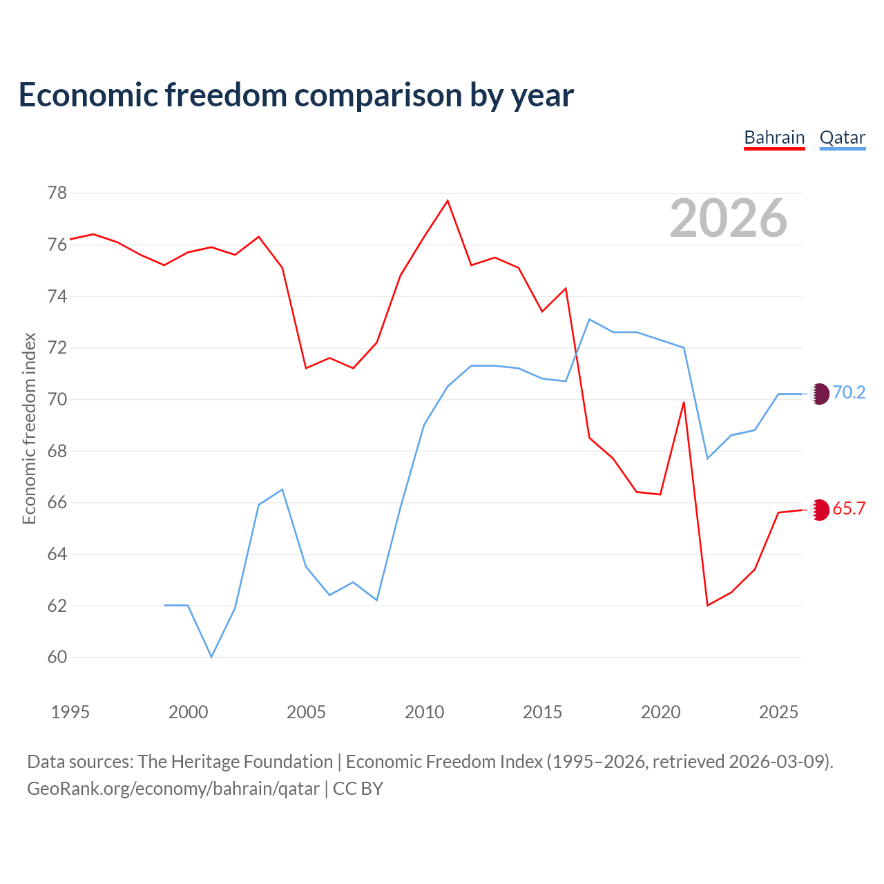 The Economic Freedom Index for Bahrain is 65.7, ranking 63/197, compared to 70.2 for Qatar, ranking 37/197. The chart above displays a comparison of annual changes in economic freedom indexes.