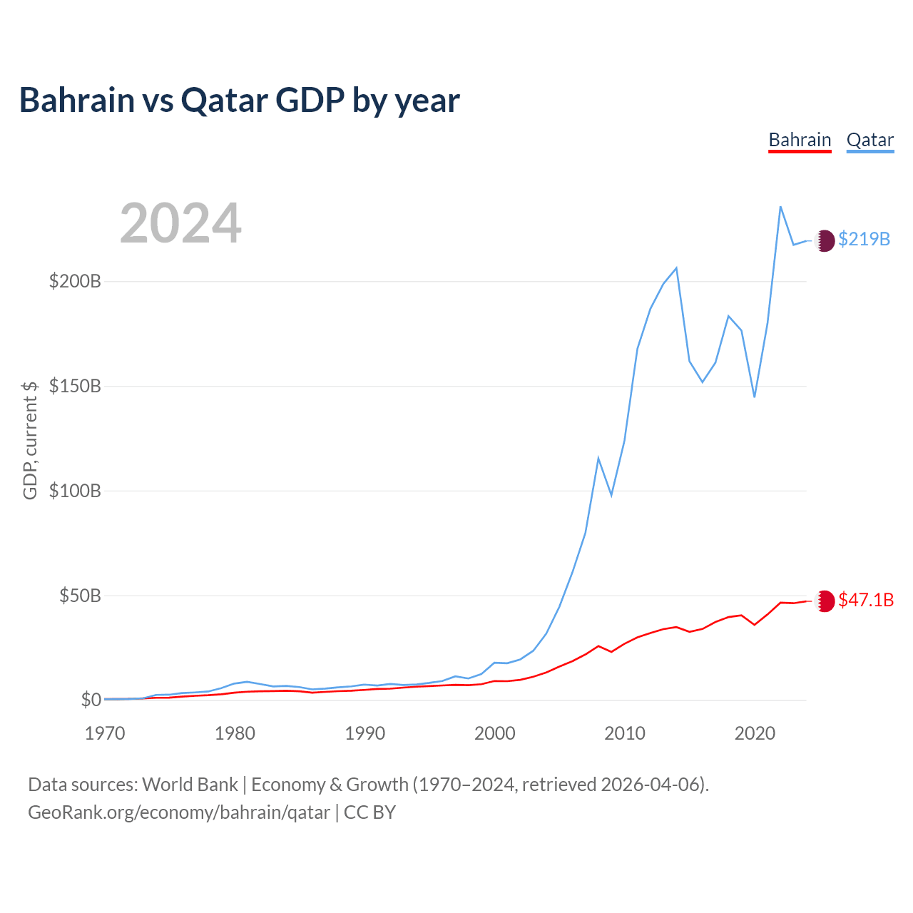Bahrain has a GDP of $47.1B compared to $219B for Qatar, ranking 96/197 and 56/197 by economy size, respectively.