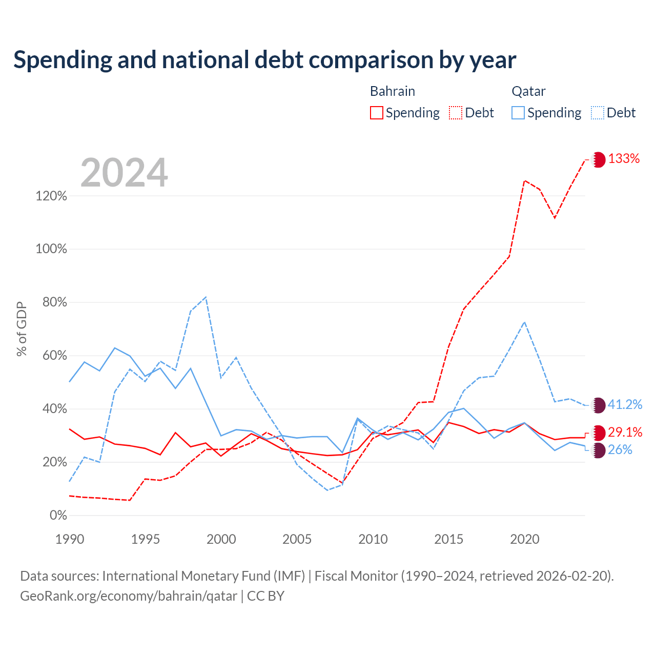 Bahrain has $62.8B in government debt (133.4% of GDP), compared to $90.2B (41.2% of GDP) in Qatar.