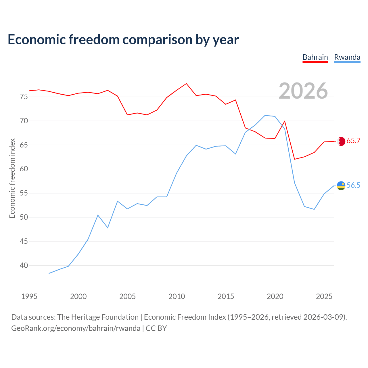 The Economic Freedom Index for Bahrain is 65.7, ranking 63/197, compared to 56.5 for Rwanda, ranking 121/197. The chart above displays a comparison of annual changes in economic freedom indexes.