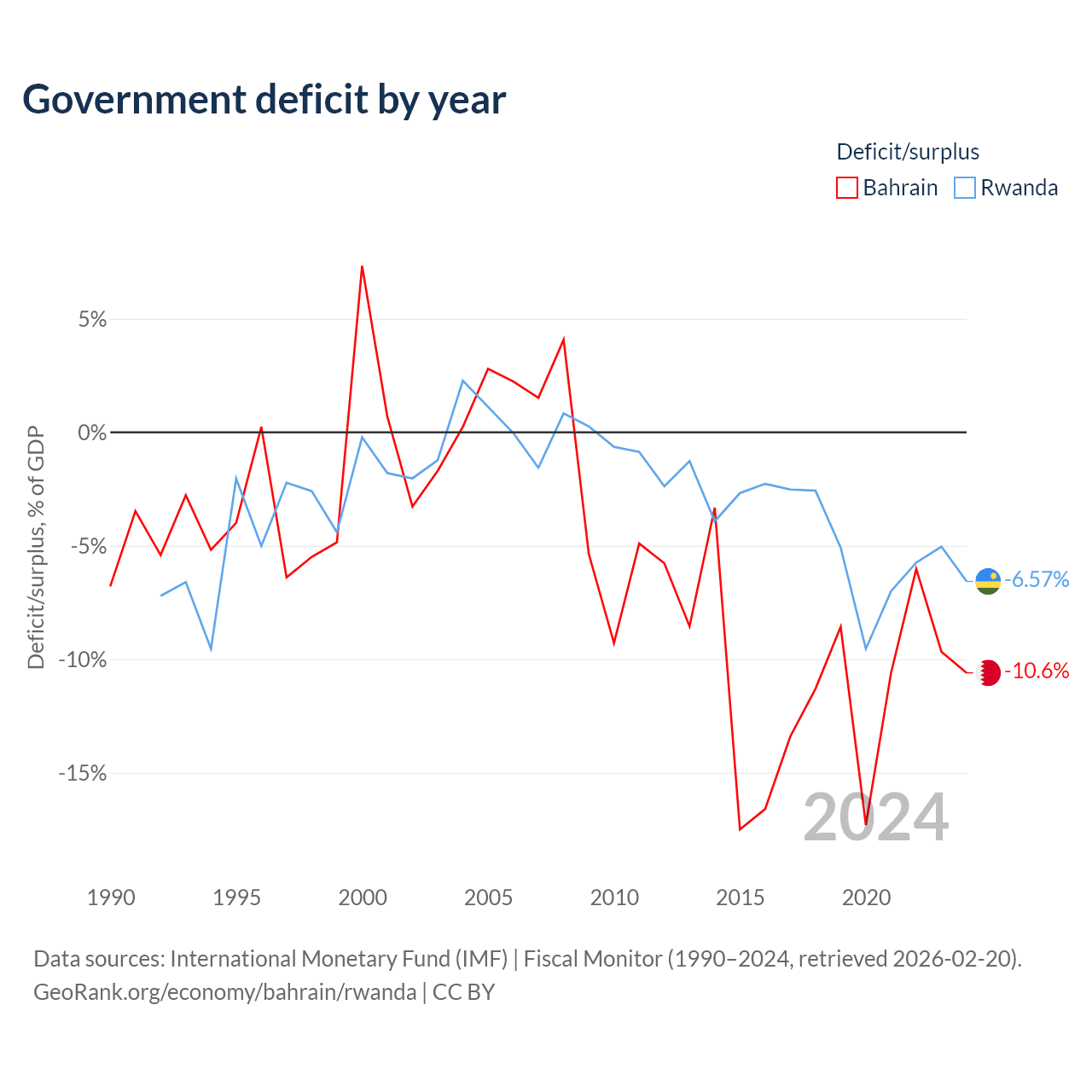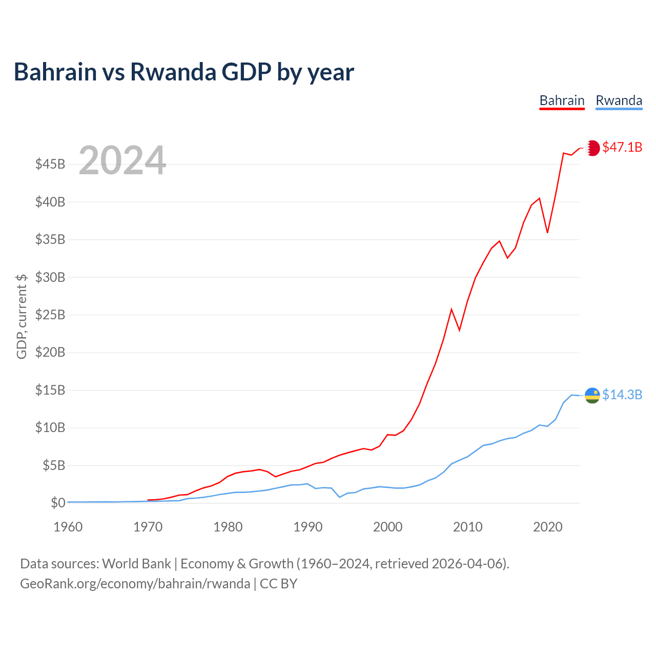Bahrain has a GDP of $47.1B compared to $14.3B for Rwanda, ranking 96/197 and 144/197 by economy size, respectively.