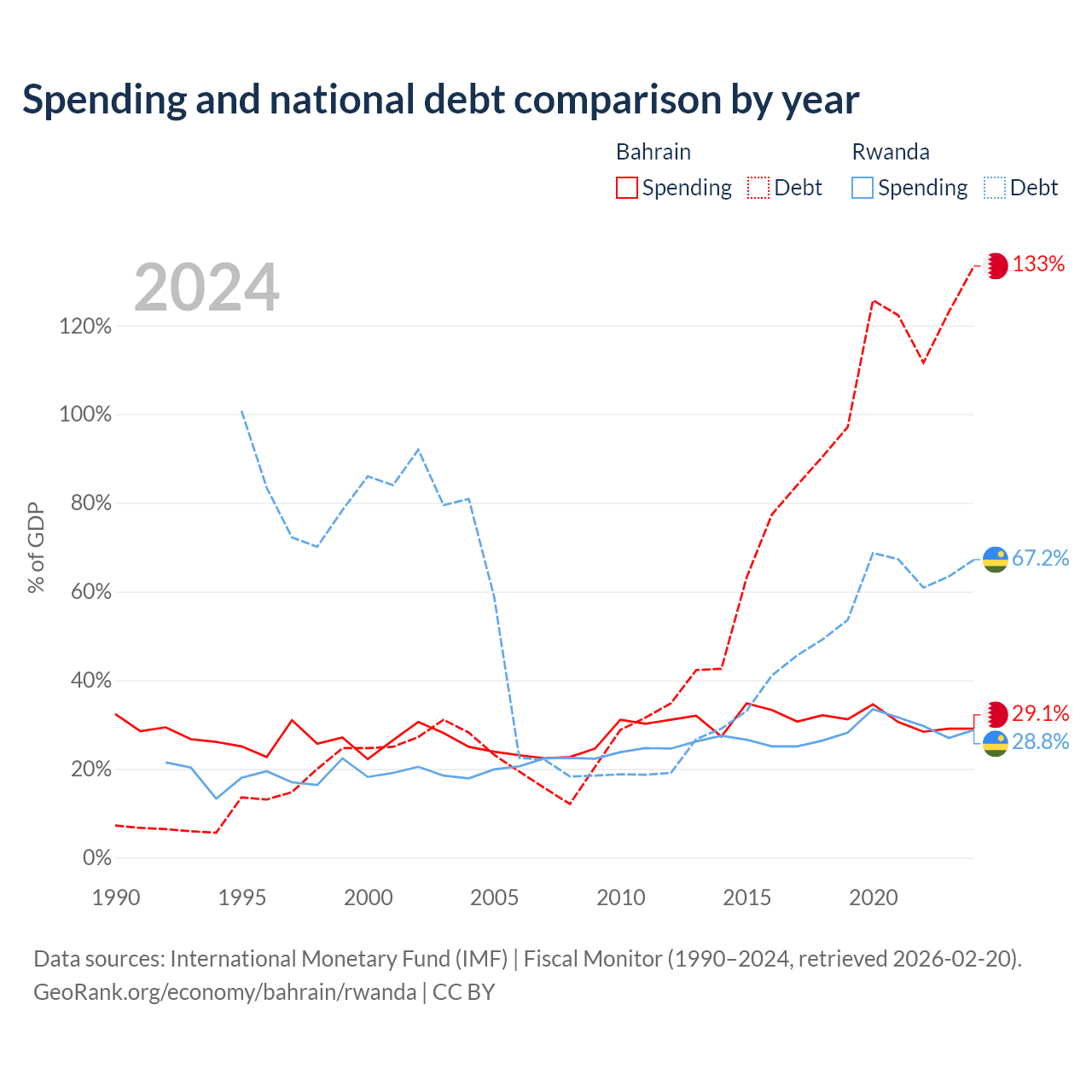 Bahrain has $62.8B in government debt (133.4% of GDP), compared to $9.58B (67.2% of GDP) in Rwanda.