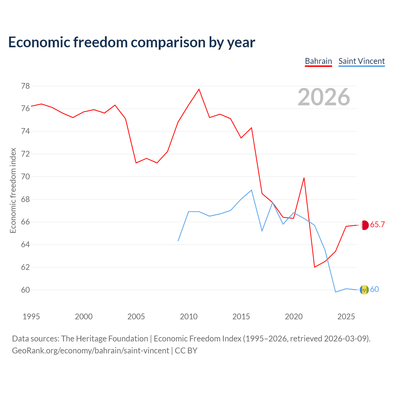 The Economic Freedom Index for Bahrain is 65.7, ranking 63/197, compared to 60 for Saint Vincent, ranking 98/197. The chart above displays a comparison of annual changes in economic freedom indexes.