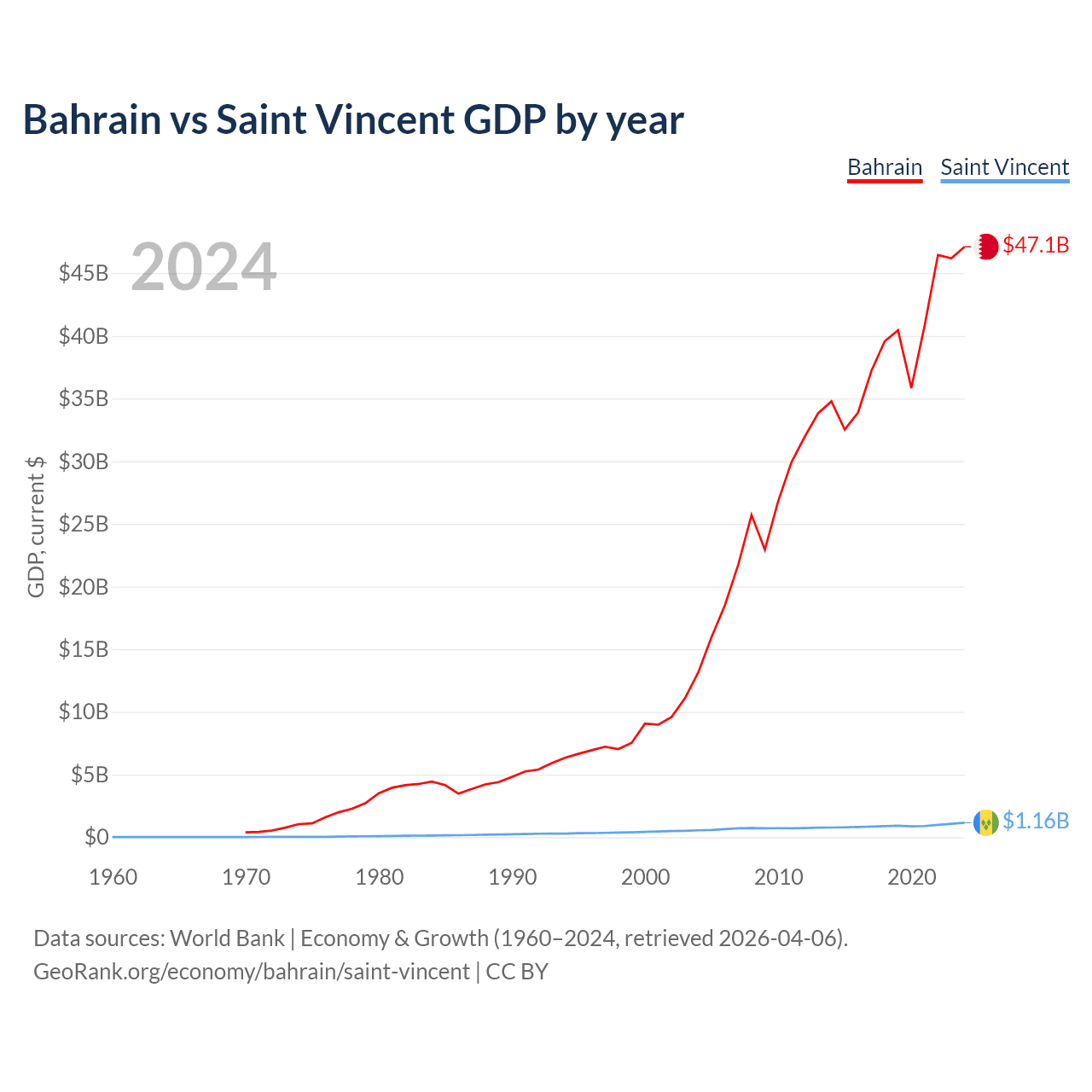 Bahrain has a GDP of $47.1B compared to $1.16B for Saint Vincent, ranking 96/197 and 186/197 by economy size, respectively.