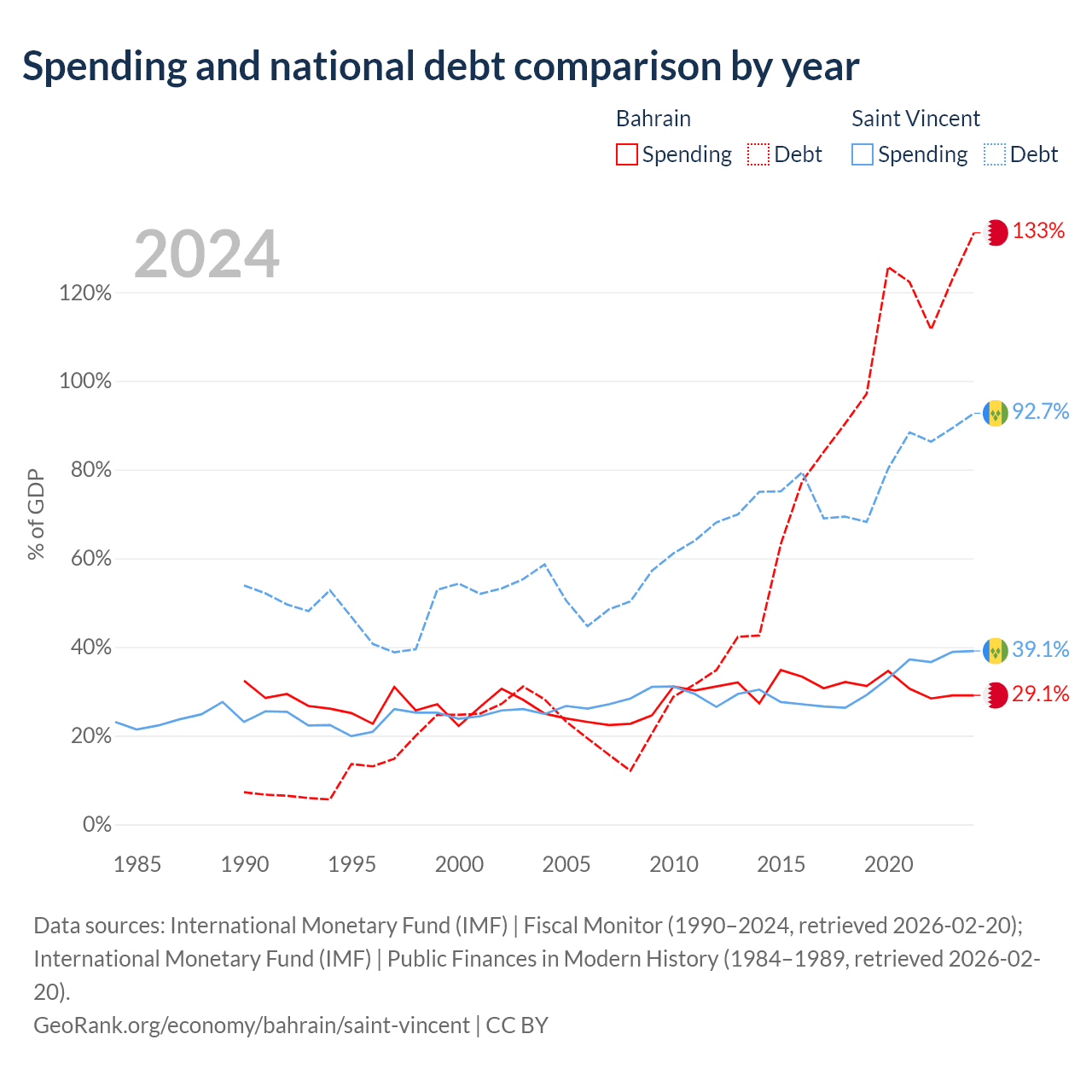 Bahrain has $62.8B in government debt (133.4% of GDP), compared to $1.07B (92.7% of GDP) in Saint Vincent.