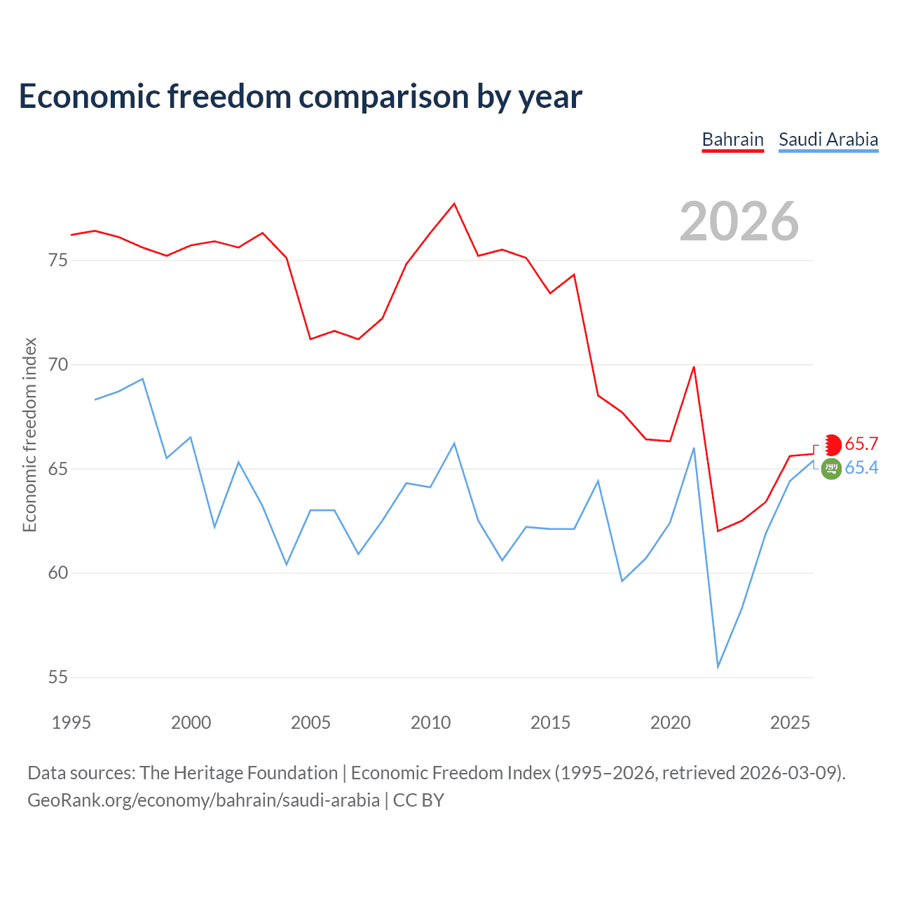 The Economic Freedom Index for Bahrain is 65.7, ranking 63/197, compared to 65.4 for Saudi Arabia, ranking 65/197. The chart above displays a comparison of annual changes in economic freedom indexes.