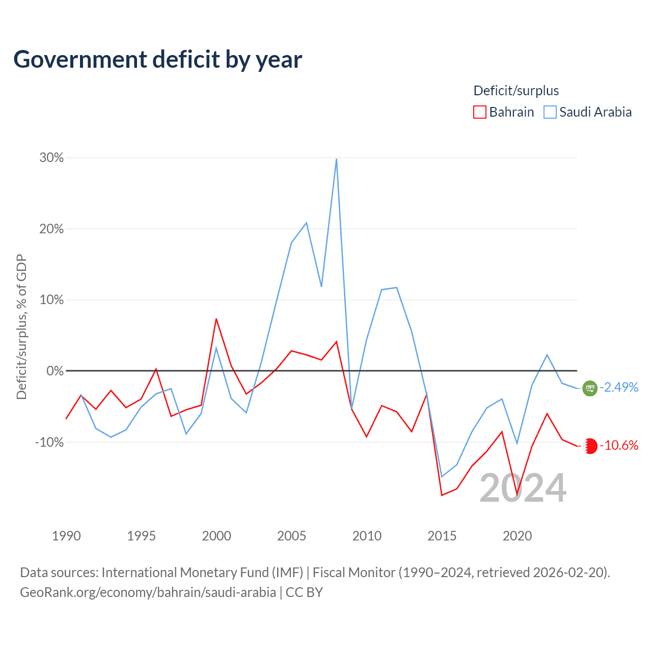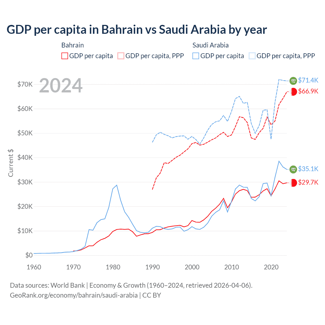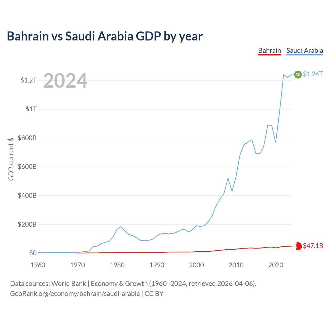 Bahrain has a GDP of $47.1B compared to $1.24T for Saudi Arabia, ranking 96/197 and 18/197 by economy size, respectively.