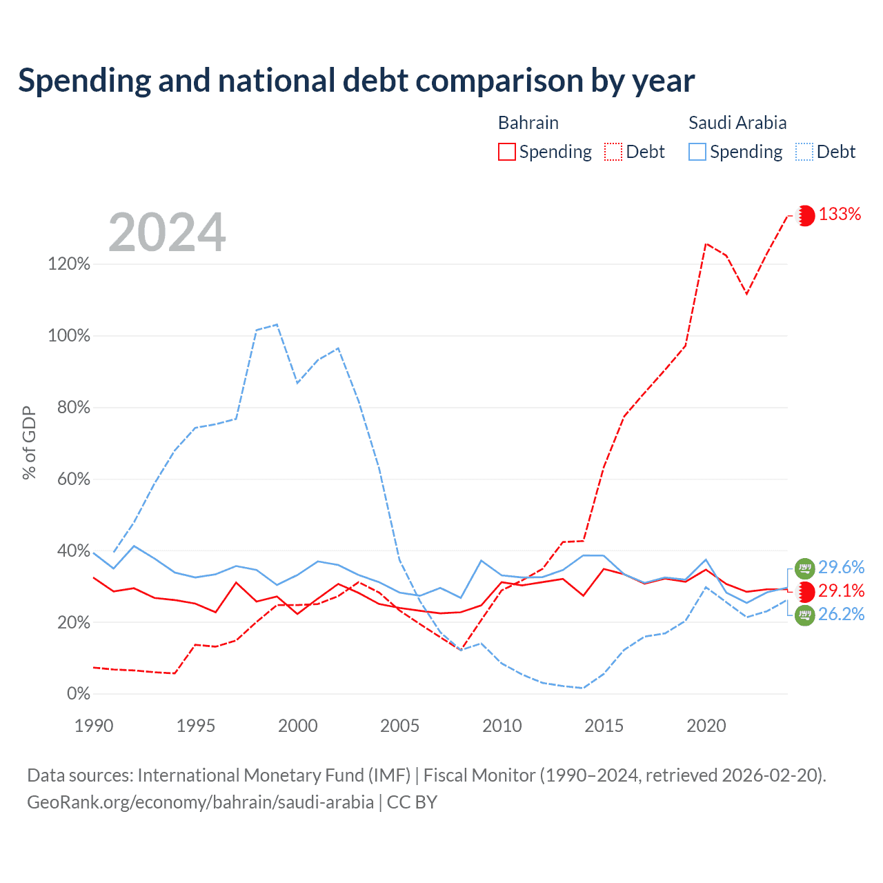 Bahrain has $62.8B in government debt (133.4% of GDP), compared to $324B (26.2% of GDP) in Saudi Arabia.