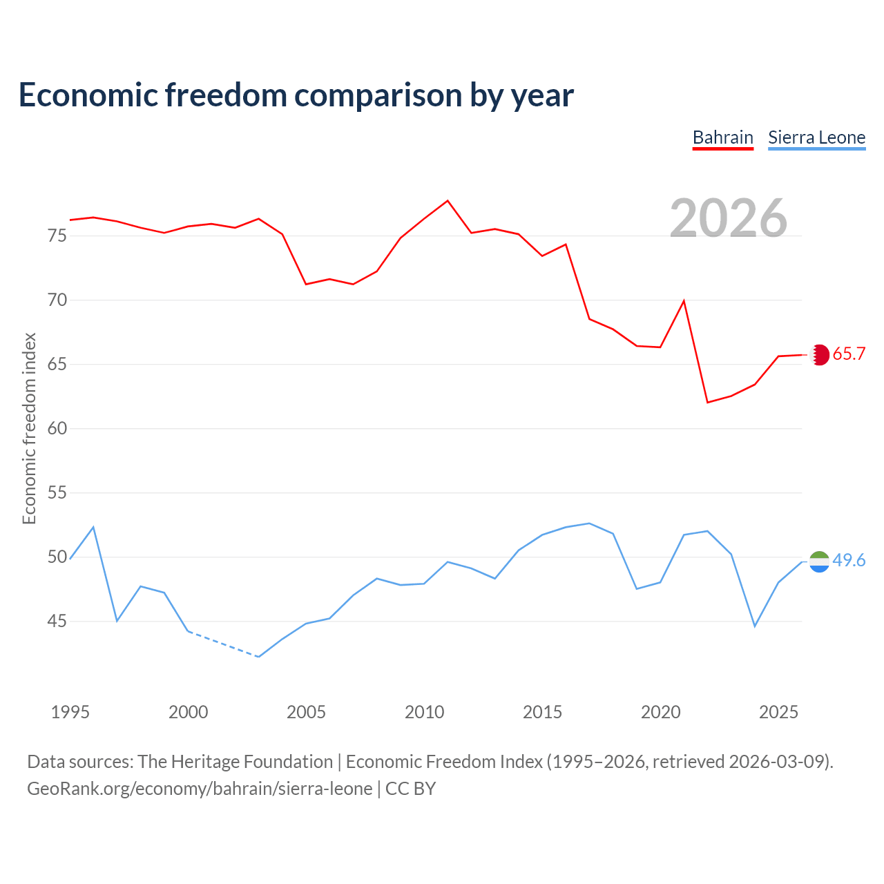The Economic Freedom Index for Bahrain is 65.7, ranking 63/197, compared to 49.6 for Sierra Leone, ranking 165/197. The chart above displays a comparison of annual changes in economic freedom indexes.