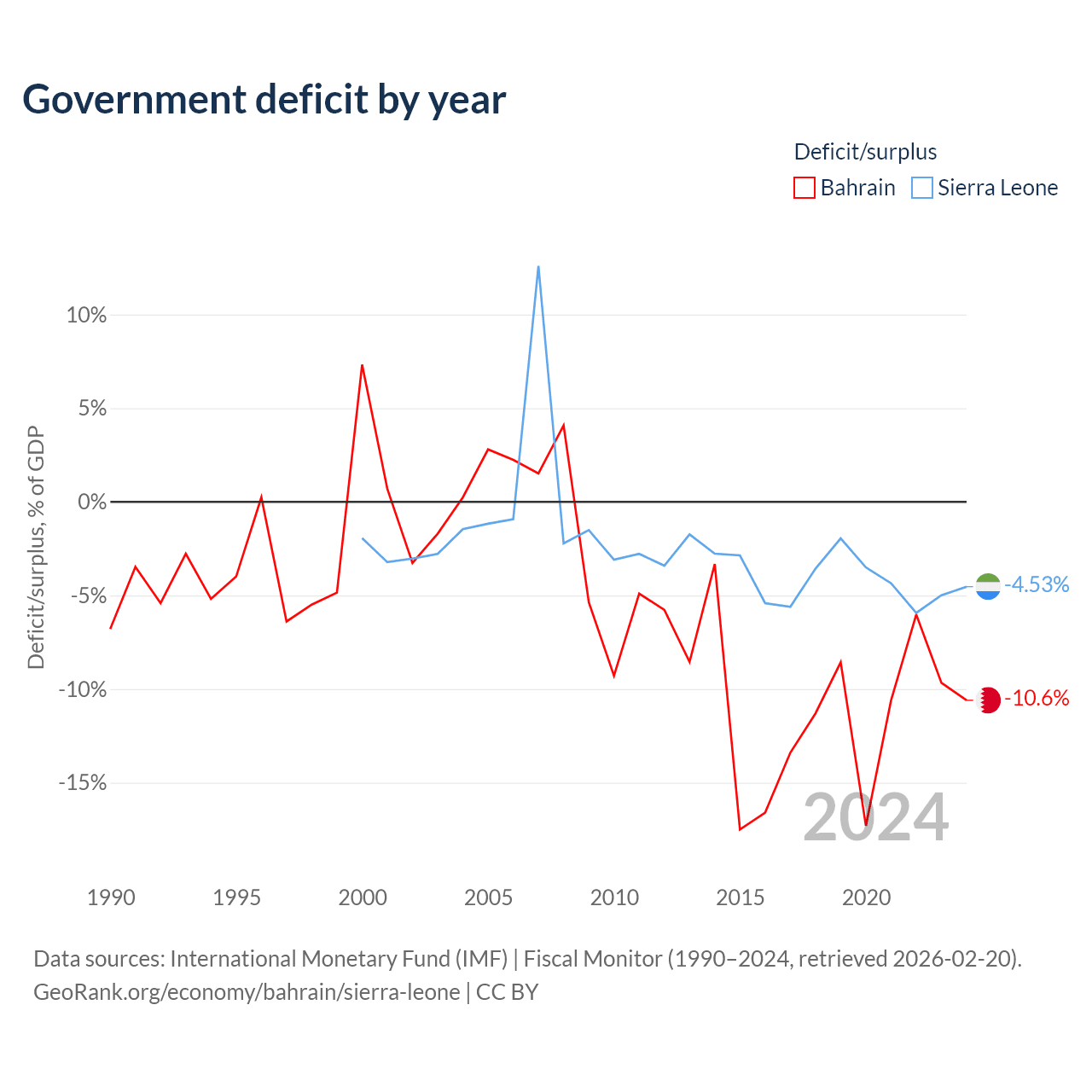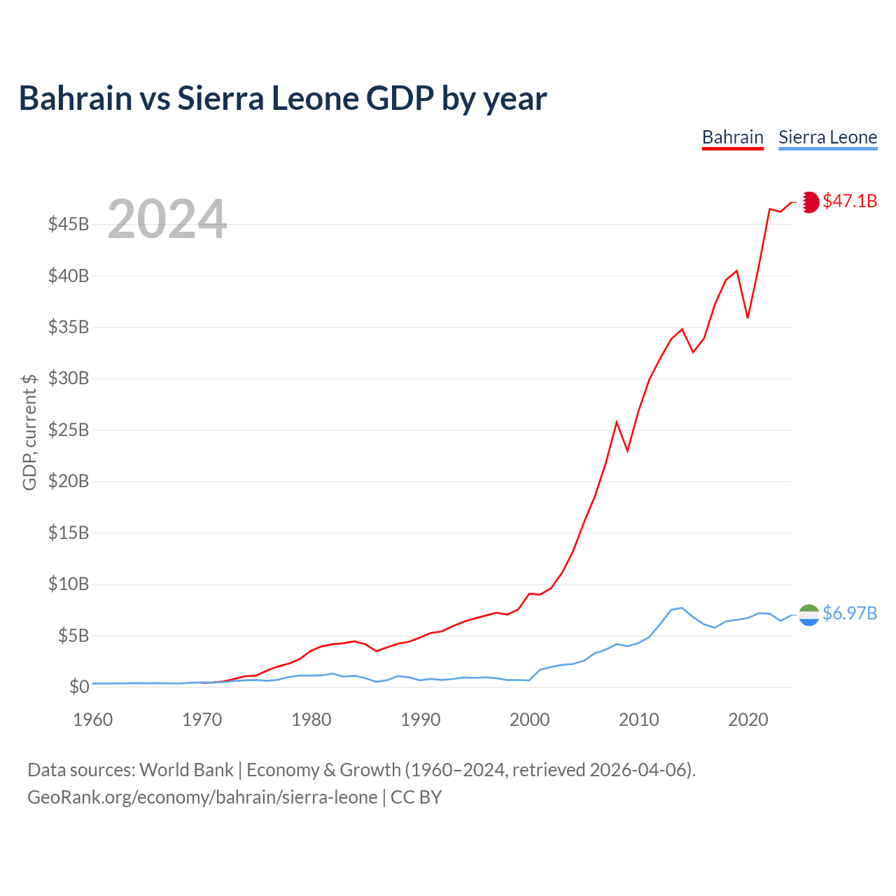 Bahrain has a GDP of $47.1B compared to $6.97B for Sierra Leone, ranking 96/197 and 160/197 by economy size, respectively.
