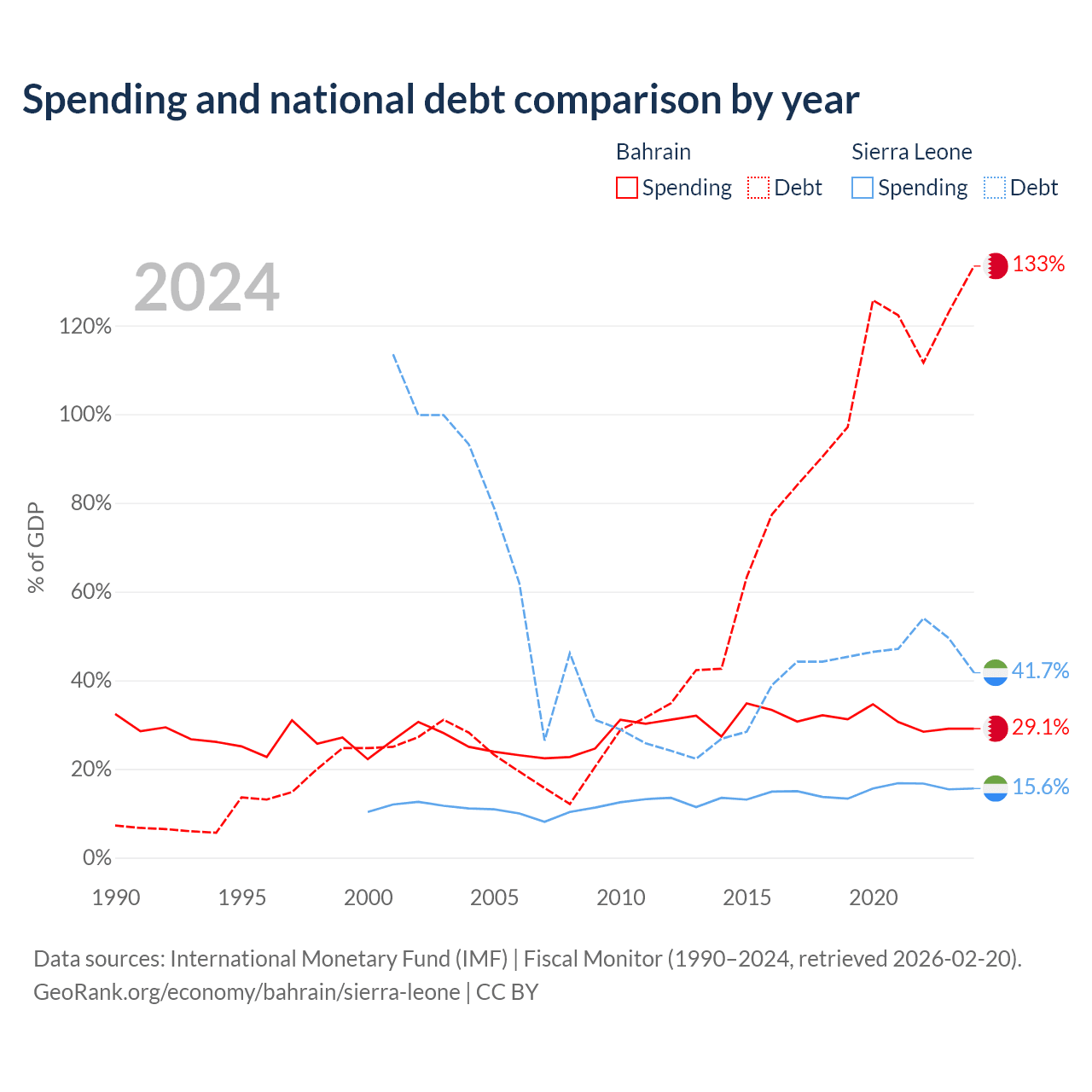 Bahrain has $62.8B in government debt (133.4% of GDP), compared to $2.91B (41.7% of GDP) in Sierra Leone.