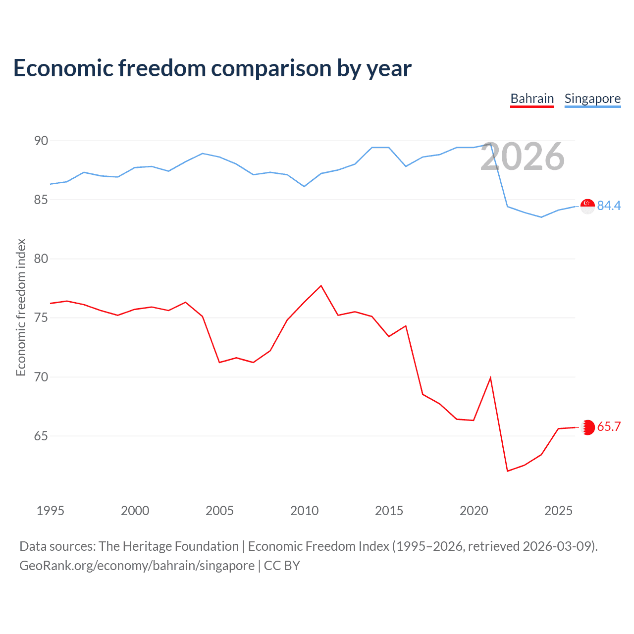 The Economic Freedom Index for Bahrain is 65.7, ranking 63/197, compared to 84.4 for Singapore, ranking 1/197. The chart above displays a comparison of annual changes in economic freedom indexes.