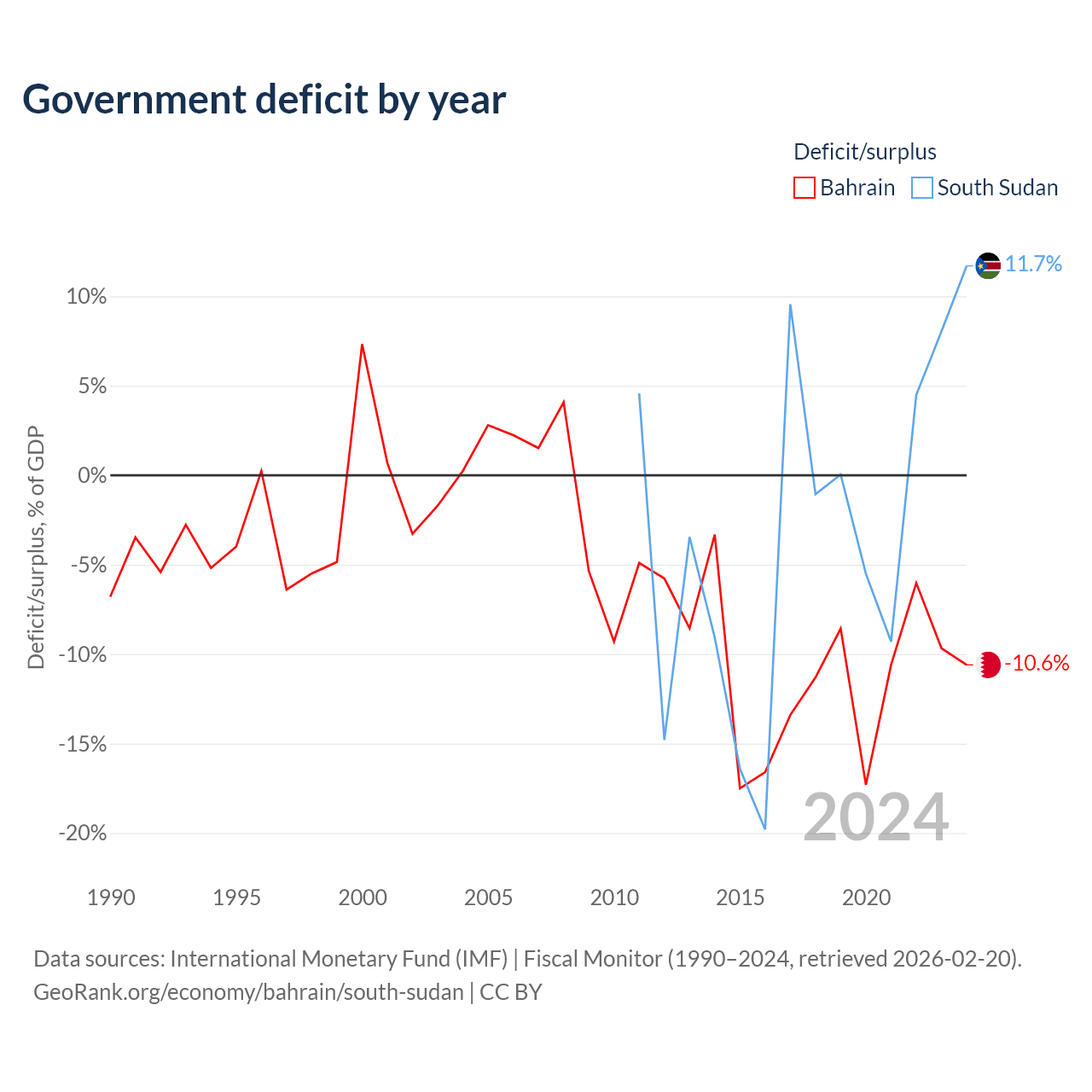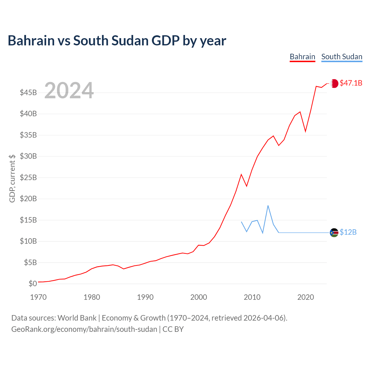 Bahrain has a GDP of $47.1B compared to $12B for South Sudan, ranking 96/197 and 149/197 by economy size, respectively.