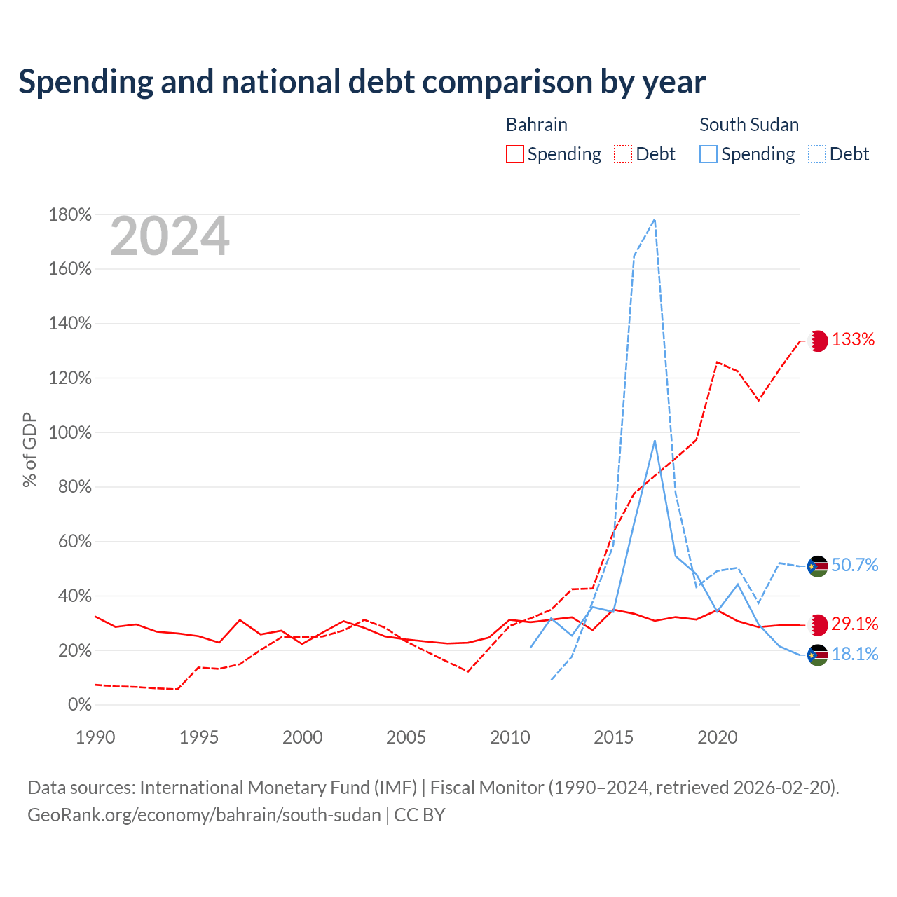 Bahrain has $62.8B in government debt (133.4% of GDP), compared to $7.04B (50.7% of GDP) in South Sudan.