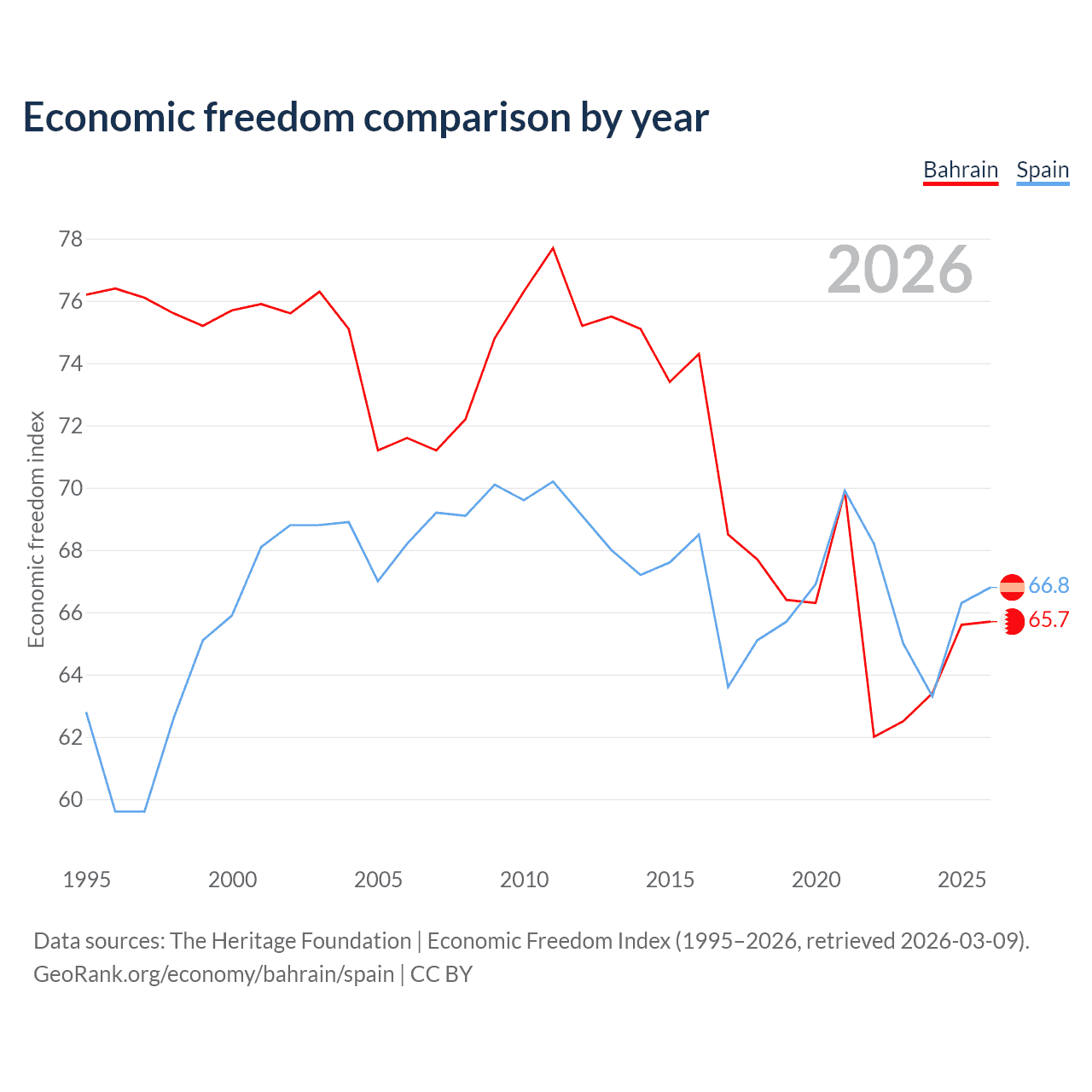 The Economic Freedom Index for Bahrain is 65.7, ranking 63/197, compared to 66.8 for Spain, ranking 59/197. The chart above displays a comparison of annual changes in economic freedom indexes.