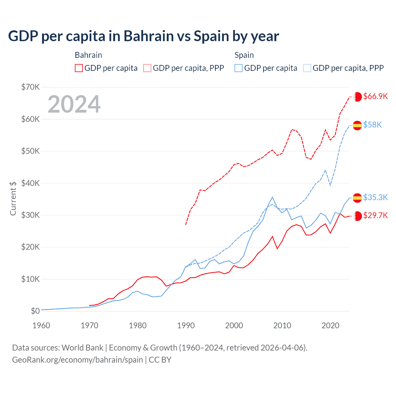 GDP per capita in Bahrain vs Spain by year