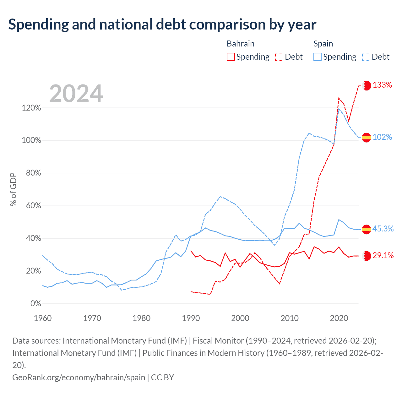 Bahrain has $62.8B in government debt (133.4% of GDP), compared to $1.75T (101.6% of GDP) in Spain.