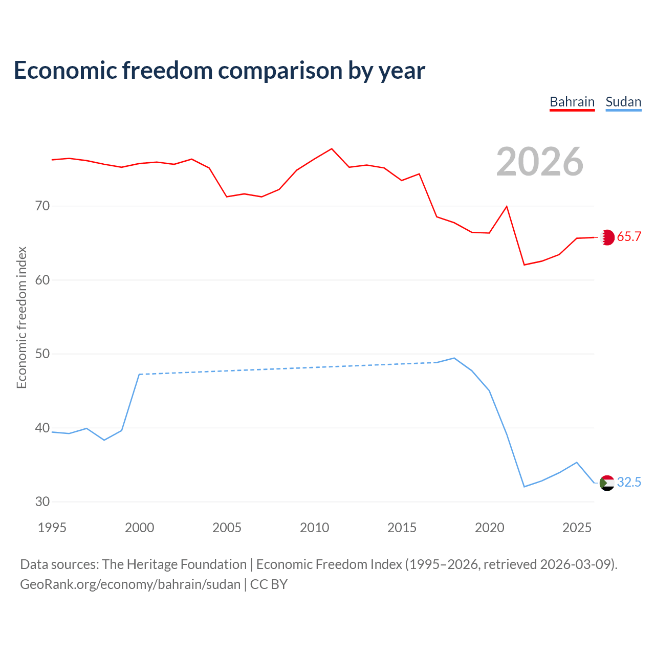 The Economic Freedom Index for Bahrain is 65.7, ranking 63/197, compared to 32.5 for Sudan, ranking 191/197. The chart above displays a comparison of annual changes in economic freedom indexes.