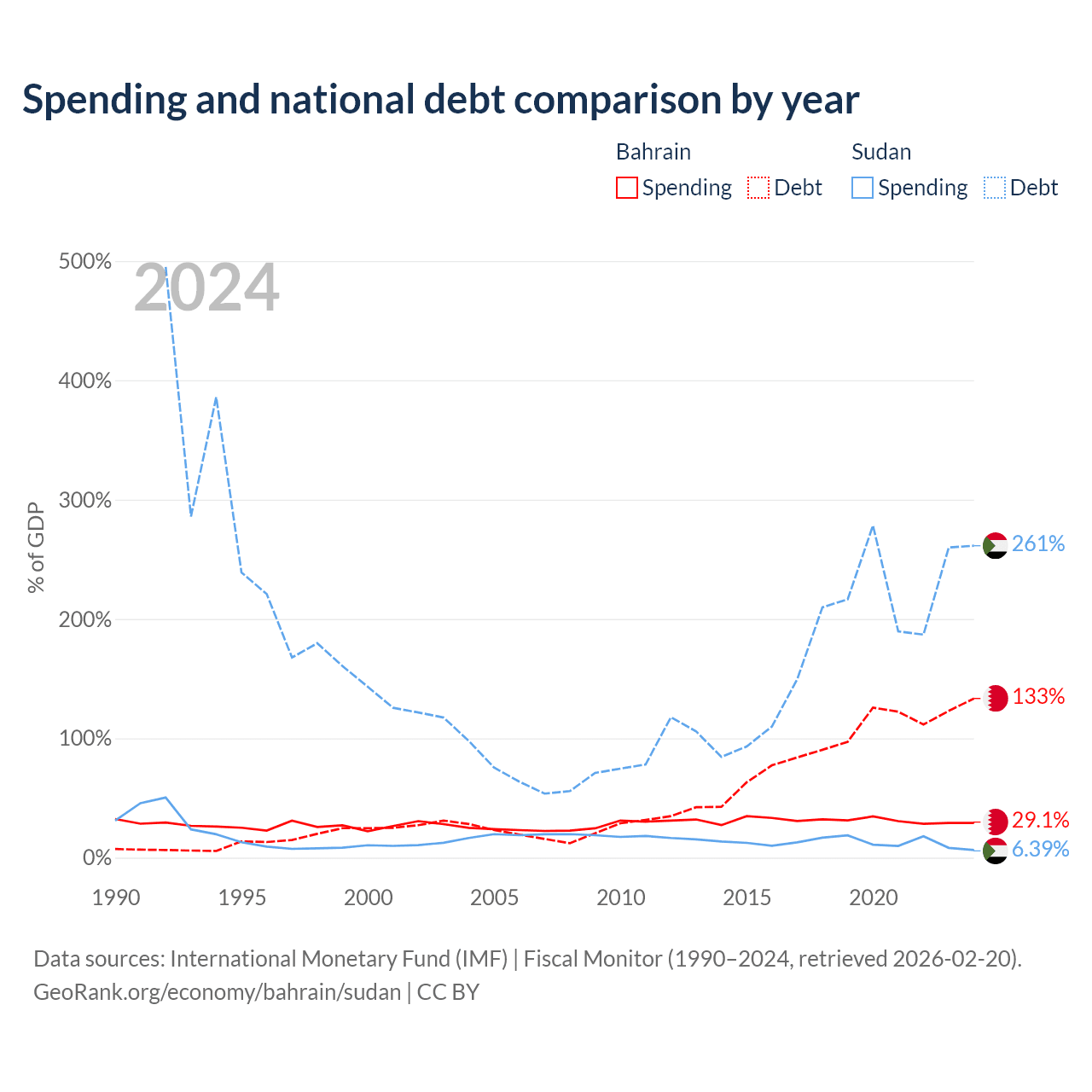 Bahrain has $62.8B in government debt (133.4% of GDP), compared to $130B (261.4% of GDP) in Sudan.