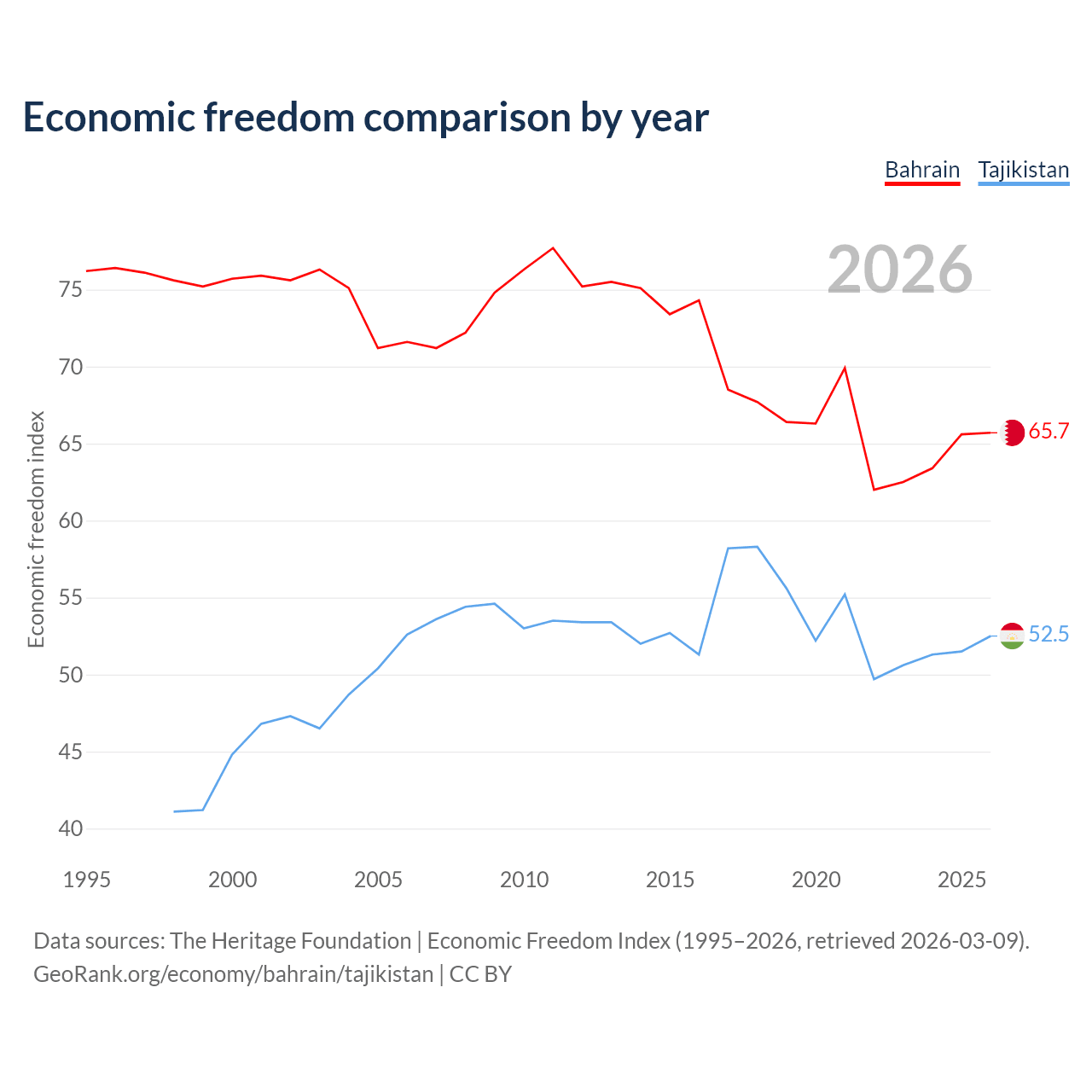 The Economic Freedom Index for Bahrain is 65.7, ranking 63/197, compared to 52.5 for Tajikistan, ranking 147/197. The chart above displays a comparison of annual changes in economic freedom indexes.
