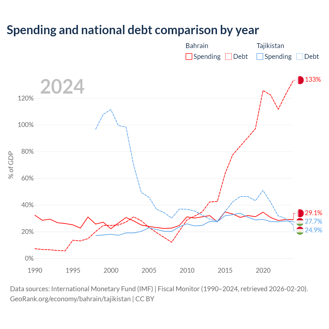 Bahrain has $62.8B in government debt (133.4% of GDP), compared to $3.54B (24.9% of GDP) in Tajikistan.