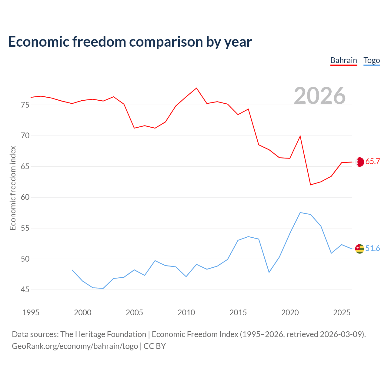 The Economic Freedom Index for Bahrain is 65.7, ranking 63/197, compared to 51.6 for Togo, ranking 153/197. The chart above displays a comparison of annual changes in economic freedom indexes.